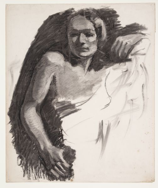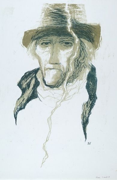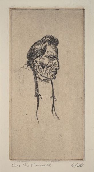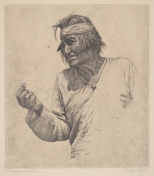 Curator: Here we have Levon West's etching from 1927, "Chief Eagle Calf". Editor: The figure stares out with such piercing, world-worn eyes, and the overall tonality, executed in etching, offers remarkable detail. The sharp contrast creates a powerful sense of realism. Curator: Indeed. West was known for his skill in capturing the likeness and character of his subjects, and his engagement with Indigenous representation during a complex period of American history offers significant insights. The print embodies a moment when Indigenous cultures were simultaneously romanticized and repressed. Editor: Look closely at the man’s features, so carefully rendered using an elaborate web of hatching and cross-hatching. The variations in line weight masterfully suggest the textures of the chief's clothing and headdress, made from animal hides, furs, and feathers. What about the object to the side, partly outside of our field of view? Curator: That is probably a drum he is holding, implying his position as not only a Chief but a spiritual leader. And in a time of significant cultural upheaval and forced assimilation, a figure like Chief Eagle Calf may have embodied a source of spiritual strength for his people, continuing their traditions and ceremonies. It is tempting to understand this formal composition as something of a radical gesture—preserving Indigenous identity against erasure. Editor: An important point. Considering this interpretation in relationship to the artist's focus, how he frames the subject within the pictorial space, allows us to understand how West strategically places the figure in the center. And it might symbolize the balance between strength and vulnerability. Curator: Exactly. Art can often be seen as both a reflection of the artist and an indicator of how larger social or political problems play out. In this case, West's print can be understood through an examination of its historical context and his position as an outsider looking in, while the masterful composition elevates Chief Eagle Calf into an icon of resistance and perseverance. Editor: For me, West's brilliance is his capability of weaving a narrative through form. Curator: It’s precisely this dance between art and lived experience, isn’t it? The historical specificity and artistry elevate this portrait, prompting reflection on broader issues.