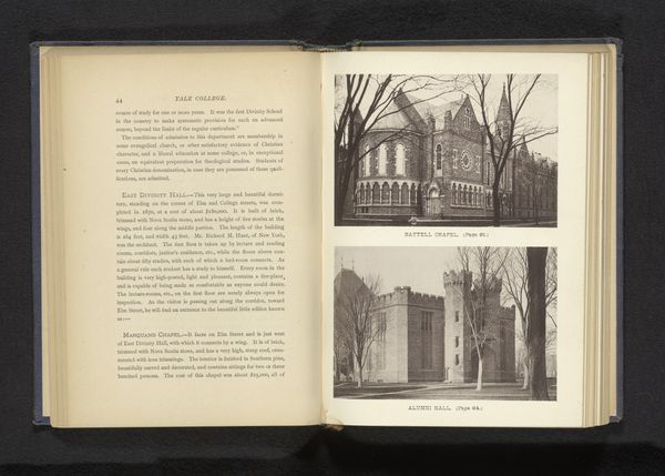 These photographs of Sheffield Hall and North Sheffield Hall were produced by James Notman, although the exact dates are unknown. They’re printed illustrations, probably made using a photomechanical process like halftone, where an image is converted into tiny dots of varying sizes to reproduce grayscale tones. This technique, emerging in the late 19th century, democratized image reproduction by replacing costly, labor-intensive engraving. The effect here is a soft, almost atmospheric rendering of the architecture. The method used to print these images speaks to broader shifts in industrial production and consumption. Notman's choice of photomechanical printing, rather than more artisanal methods, underscores a transition towards mass production and efficiency. The images capture the early days of Yale, but they also subtly reflect a society increasingly shaped by technological innovation and the changing nature of work itself. By considering the materials and methods, we gain a deeper understanding of how images like these contributed to shaping perceptions of institutions like Yale, and the values they represent.