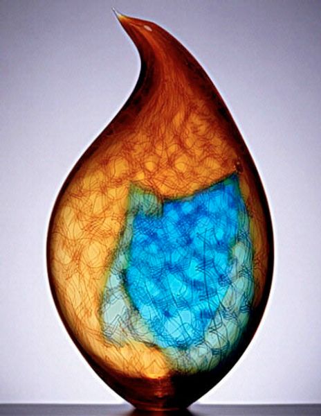 Editor: Here we have Lino Tagliapietra’s "Madras," crafted in 1999. It appears to be a glass sculpture, and the linear details are just incredible! What strikes me most is its warmth; it reminds me of a flame, yet there's a contained stillness to it. What do you see in this piece? Curator: The 'flame' you see is telling. Fire, across cultures, often symbolizes transformation, passion, and even destruction. Look closer at the piece's form; its teardrop shape echoes ancient vessels used for libations or precious oils. Tagliapietra, steeped in Muranese glassblowing tradition, isn't just shaping glass; he’s invoking centuries of cultural memory. Do you notice how the lines, so meticulously placed, create an almost textile-like surface? Editor: Yes, it's incredible! The texture seems to vibrate, giving a real sense of movement. Is there any particular reason to see "textile"? Curator: Absolutely. Consider the title: 'Madras' - immediately suggesting the vibrant patterns of Indian textiles. This intersection of glass and textile traditions sparks interesting questions. How does one culture influence another? What happens when a traditionally fluid material, like glass, mimics the structured patterns of woven cloth? And how does that mimicry alter our perception of both? Editor: So it is all about references. I suppose that a glass sculpture titled "Madras" compels viewers to seek meaning, connecting traditions, and maybe questioning our notions of cultural exchange and transformation. Curator: Precisely! By blending form, material, and symbolic title, Tagliapietra invites us to participate in a cross-cultural dialogue, encouraging a re-evaluation of artistic heritage. Editor: It's fascinating to see how the layering of meaning through form and title elevates this sculpture beyond mere aesthetics. Thanks!