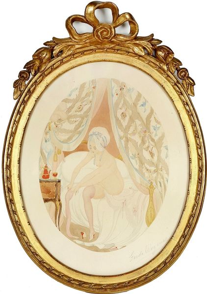Curator: “Lady in Front of a Mirror” painted around 1670 by Frans van Mieris the Elder... I'm really struck by the texture of the fabrics in this painting. I find it beautiful. What do you make of this piece? Editor: It’s interesting how Mieris renders luxury through paint itself, right? Look at the sheen on her dress, the detail in the Persian rug, the elaborate chair… it's all about displaying wealth through these meticulously crafted objects. Can we really separate this celebration of material culture from the historical context? Curator: Exactly! This wasn't just about representing luxury, but actively *constructing* it for the viewer. The labor involved in creating such detailed garments, or obtaining those exotic goods—that’s all present here, even if only implicitly. We see a reflection of the consumerism that fueled the Dutch Golden Age. Does this work seem almost complicit in that, or is it critiquing something else? Editor: I can see your point. There's also that small dog – a clear sign of wealth and leisure, but is Mieris making a statement about domesticity here? I mean, is there something relevant in terms of this period's gender dynamics, as reflected through such a 'mundane' object as a domestic animal? Curator: Interesting, but how would such a dynamic affect Mieris' approach to painting in the 17th century? Does this period’s approach make such analysis simpler or more complicated for us today? It is a challenge to balance what appears to us and what they might have thought, even though we can study some things... Editor: That is true. Thinking about all of this new information is pretty enlightening, so thanks for this explanation, really helped! Curator: It has been great sharing this with you; I also learned a few things as well.