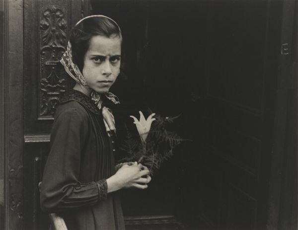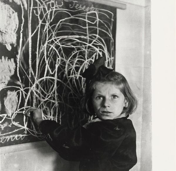 Curator: Today, we are considering "Ann in Chinatown, New York" by Arthur Tress, a photograph dating back to 1958. Editor: Oh, my gosh, what a fantastic image! This kid is pure spunk. Winking at the camera like she owns the street, right? You can almost hear her laughter bubbling out. Curator: Indeed. Note the composition, which is quite striking. Tress places Ann slightly off-center against a wall covered in what appears to be frantic scribbles, a chaotic background juxtaposed with her direct gaze. Semiotically, we might read the wall as representing the dynamism and unrestrained nature of childhood, a marked contrast with the carefully considered pose. Editor: Hmm, that wall. To me, it looks like a chalkboard where someone was trying to diagram the universe! Like, here’s the world as seen through a kid’s imagination, complete with all the wild connections that only make sense to them. She’s claiming her space amid that glorious mess. Curator: An interesting interpretation. I also observe Tress's masterful use of light and shadow. The photograph employs high contrast to create visual drama. Consider how the textures are rendered; you can feel the rough surface of the wall and the softness of Ann's coat. Editor: You’re right, those textures really pop. It feels both gritty and intimate, like you're standing right there, part of that moment in time. I like to imagine she's telling a really outrageous story that you absolutely can't believe but want to hear every last word of. Curator: One might see the picture also as a document. The photo invites a reading through a social realist lens; It is part of street photography showing the real-life scenarios. Editor: Well, for me, this shot embodies that sweet, sassy spirit of youth in the face of a complex and ever-changing world. Arthur Tress has created a beautiful image, like capturing lightning in a bottle. Curator: Precisely. His lens reveals a particular intensity. This single frame manages to communicate multiple levels of meaning in ways that invite diverse critical engagements.