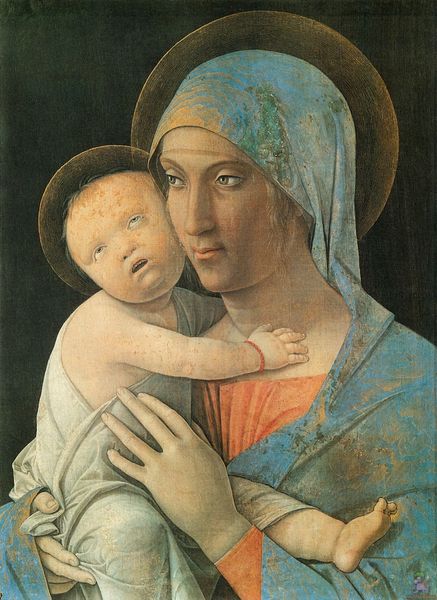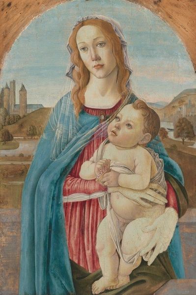 Curator: Before us hangs Pietro Perugino's "Madonna with Child," completed around 1473, an oil painting that exemplifies the burgeoning High Renaissance style. Editor: Aah, serenity in a bottle! The Madonna's gaze, lowered and gentle, gives the whole scene this soft, almost dreamlike quality. What I love most is the feeling of protected intimacy radiating from their joined hands. It pulls you right in! Curator: Indeed, the work relies heavily on compositional harmony and the manipulation of color. Notice how Perugino uses the Virgin's blue robe to create a strong visual anchor, drawing the eye from top to bottom, subtly contrasted against the warmer tones of her dress and the baby's skin. Editor: I find myself wondering about the little guy’s seriousness though! With the dramatic chubby limbs, all I can feel is how real this work wants to make itself appear! The slight imperfection to the features and skin are so lovely; far better than the plastic images of many newer paintings. Curator: Absolutely. This portrayal departs from earlier, more stylized depictions. The figuration, the attempt to render the Madonna and child with a degree of realism, and naturalism signals a key transition in Renaissance art. Moreover, we can interpret their positions through structuralism and their inherent, hierarchical roles as social constructs. Editor: Ah, social constructs. Sometimes, I get so lost in a piece like this that I lose sight of the larger framework. However you want to look at it though, this painting remains simply sweet and hopeful. Curator: Precisely. The layering of hues in Perugino’s brushstrokes creates a powerful, but nuanced portrayal; the symbolic importance within a perfectly realized pyramidal structure speaks to the High Renaissance emphasis on order, balance, and ideal beauty. Editor: You have provided me the proper words to name what was once nothing more than my pure feeling. I am ever grateful for your ability to do so. Curator: And I thank you for grounding my interpretation within an emotional context that makes this Madonna's humanity ever accessible.