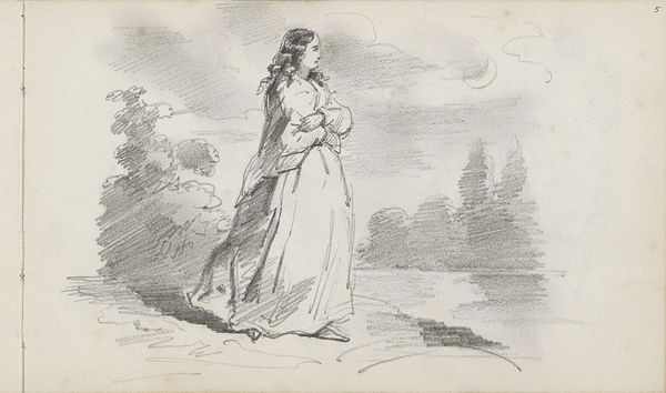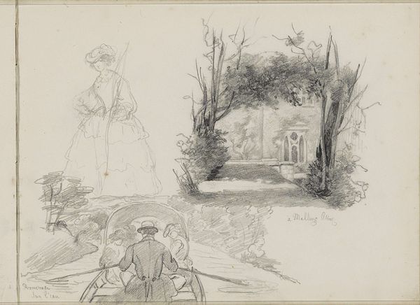 Charles Rochussen created this graphite drawing titled, *Church in a Landscape, a Walking and a Standing Woman*, sometime in the 19th century. Rochussen was a Dutch painter, printmaker, and illustrator known for his depictions of daily life, often with a humorous touch. In this drawing, the artist sketches two women within a landscape featuring a church. The standing woman is formally dressed, which contrasts with the relative simplicity of the natural setting. The artist seems to be making a comment on societal positions, gender roles, and their relationship to the environment. The artist seems to portray the conventional expectations of women in 19th-century Dutch society, who were often confined to specific roles and spaces. The drawing invites us to reflect on the historical and cultural contexts that shape individual identities and experiences. This piece serves as a poignant reminder of the intricate interplay between gender, class, and environment during the 19th century.