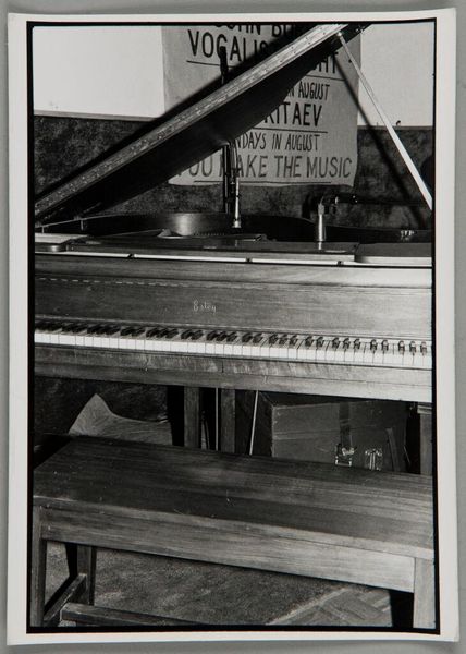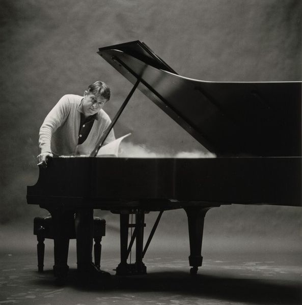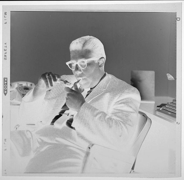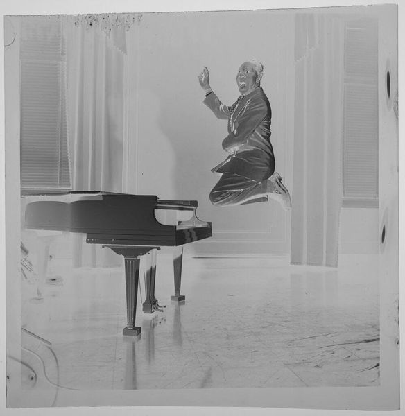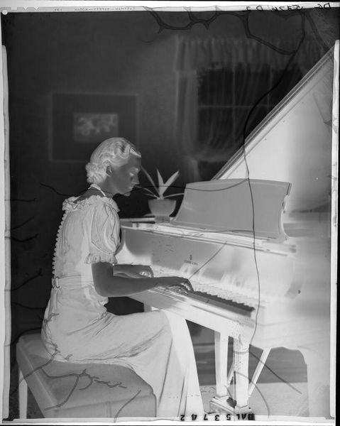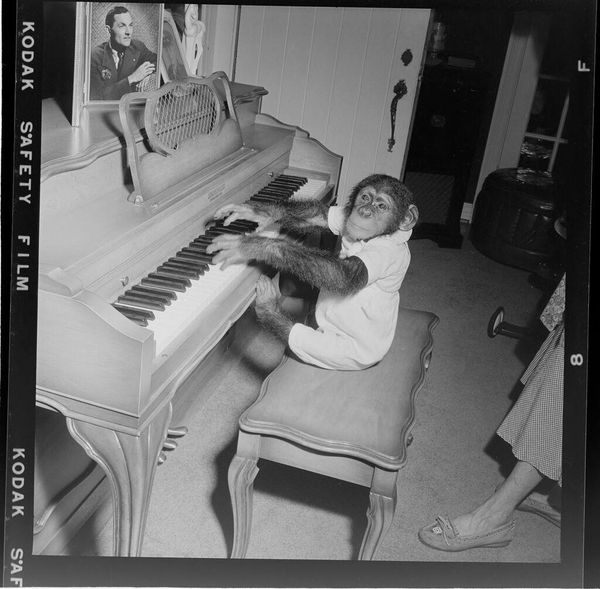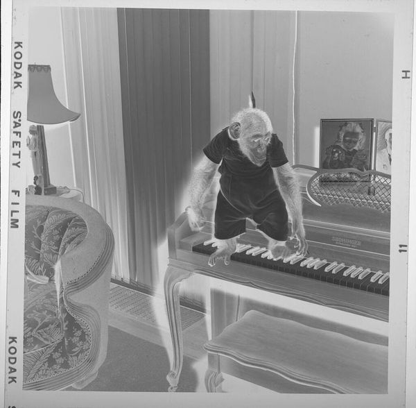 Editor: This small, untitled photograph by Jack Gould depicts a monkey seated at a piano. It has a surreal, almost unsettling quality. What symbolic weight do you think this image carries? Curator: The monkey, often a symbol of mimicry, is placed in a domestic setting, playing an instrument tied to human expression. Is this a comment on our own societal performances, the way we imitate and create culture? What does this juxtaposition evoke for you? Editor: It makes me think about the blurred lines between nature and culture. We dress the monkey, teach it to play, but it remains fundamentally…other. Curator: Exactly. And consider the photographic negative itself. What hidden truths are being revealed, or perhaps distorted? The image invites us to reflect on how we define “human” and what it means to truly express ourselves. Editor: That's fascinating. I hadn’t considered the photograph’s process as part of the meaning. Thank you! Curator: A pleasure! It's in the layering of these symbols that we find deeper resonance.