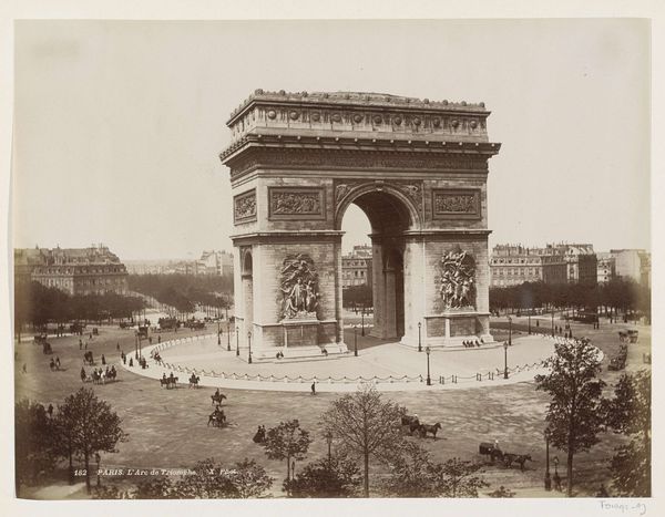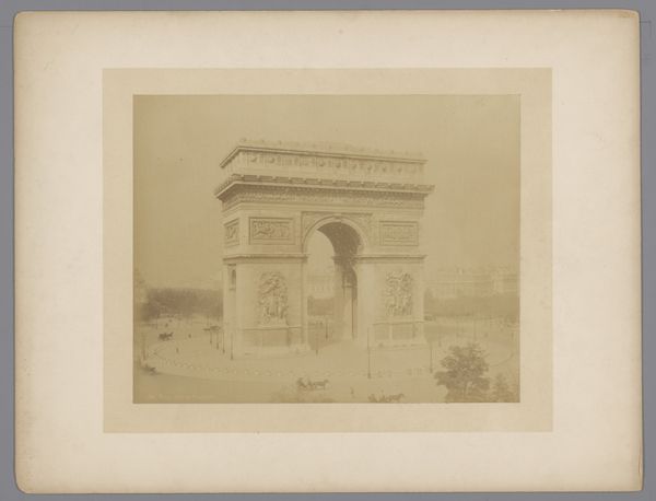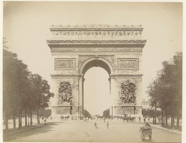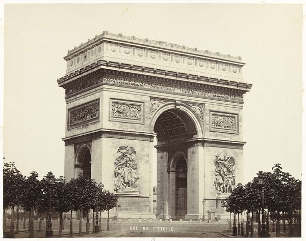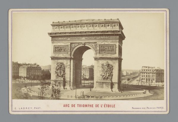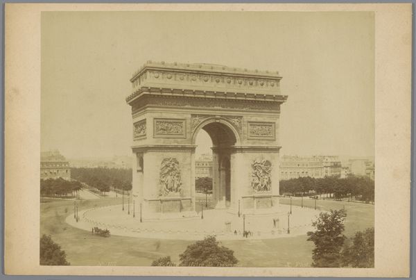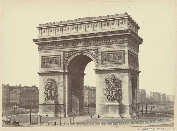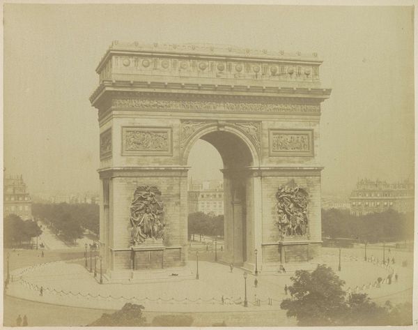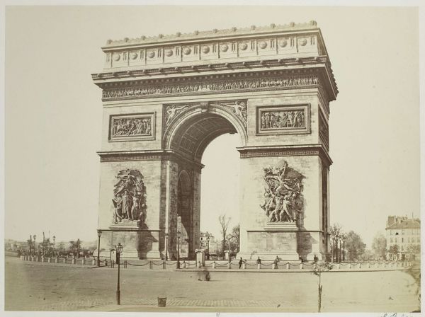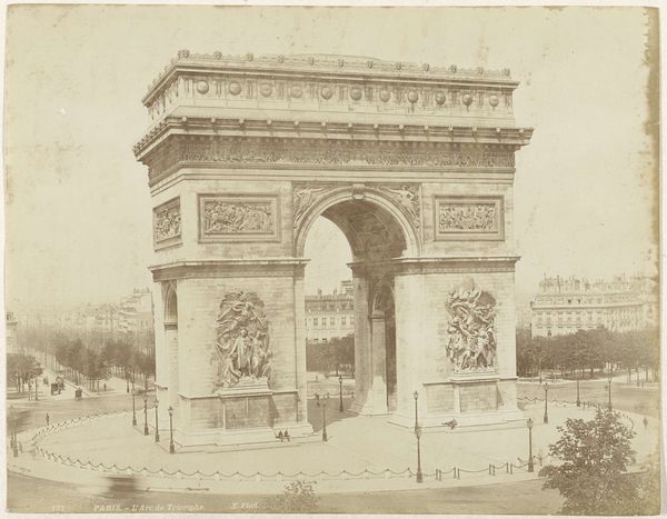 Curator: Here we have Édouard Baldus’s “Gezicht op de Arc de Triomphe te Parijs," or "View of the Arc de Triomphe in Paris," a photographic print made before 1875. Editor: It strikes me as incredibly solid. So imposing, like a statement frozen in time. It’s powerful, but with a sort of melancholy, maybe because of the grayscale. Curator: Yes, Baldus really captured the monumentality, didn't he? As a photographer, he was fascinated with architectural spaces and public works, documenting the transformation of France during the 19th century. Editor: There's something so deliberate about the composition. How Baldus has placed the camera seems intended to really show the precise relationships of mass and proportion that the neoclassical architects were obsessing over. Look at how the surrounding areas feel secondary—the Arc dominates completely. Curator: Absolutely. And the use of photography as a medium—well, it elevated documentation to high art. Photography lent this perceived objectivity. Editor: And look at the tonal range; it allows us to understand the intricacies of the sculptures carved into the stone. How the interplay of light and shadow makes it really three-dimensional, almost tactile. Curator: What I find compelling is that he wasn't just passively recording; he was choosing vantage points and playing with light to convey specific emotions and ideologies associated with French grandeur. It's interesting how Baldus was working when the idea of photography itself was so contested, with its role in art still not resolved. Editor: Well, seeing how this single piece combines that sense of civic pride and almost detached study of form makes you consider those very oppositions; art and document. Very striking! Curator: Yes, it captures both the spirit of the time and an enduring study in the beauty of form.