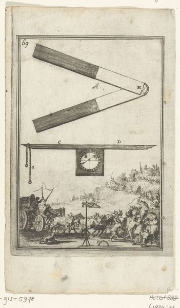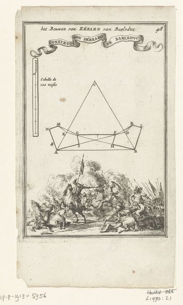 This illustration for 'Den Arbeid van Mars' was created by Romeyn de Hooghe in the Netherlands during the late 17th century. Created for a book by Allain Manesson Mallet, the print combines mathematical diagrams with a chaotic battle scene. We see geometry imposed upon the chaos of warfare. The cool rationality of the diagrams contrasts sharply with the violence below, suggesting a detached, almost clinical approach to military strategy. De Hooghe lived in a time of great political and military upheaval in the Netherlands. His work often reflected the intersection of war, politics, and social life. He was commissioned to document events from the Franco-Dutch war, and became known for allegorical and propaganda prints, as well as topographical works and maps. This image encapsulates how the science of war developed during the 17th century, and invites reflection on the human cost of military campaigns.