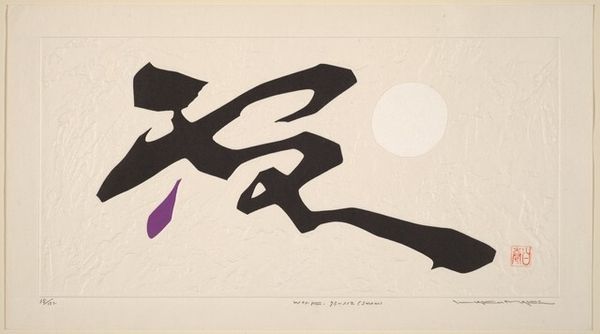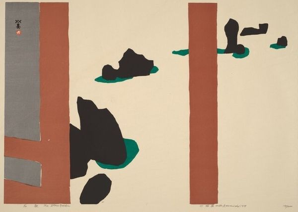 Editor: Here we have Maki Haku's "Rest" from 1973, a mixed-media stencil print. I’m struck by the simplicity, the stark contrast between the black shapes and the white space. There's almost a sense of Japanese calligraphy to it. What do you see in this piece? Curator: I see a powerful commentary on the performative demands of modern life, particularly for women. Consider the title: "Rest." What does rest *mean* in a patriarchal society that constantly pushes for productivity and self-optimization, especially for those who are marginalized? Editor: I hadn’t considered that! So the black shapes aren’t just abstract forms, but perhaps represent…obstacles? Or pressures? Curator: Precisely! They could be interpreted as the weight of societal expectations, the fragmented self struggling to find stillness. And that small, defiant circle of yellow - a point of resistance, a glimmer of hope perhaps? It makes me think about intersectional feminism and how we reclaim space for self-care and genuine rest, which become acts of rebellion against oppressive systems. Where do you see hope for resisting this? Editor: Well, there's something comforting in the asymmetry and imperfection. Maybe those jagged shapes acknowledge that resistance doesn't have to be polished. It just *is*. The whole form pushes against perfection and constraint! Curator: I completely agree. It resists the visual trope that we need perfectly ordered self-care in order to benefit, in a capitalist culture. By simply resting. Editor: Thinking about it this way has completely transformed my understanding of the work! I went from thinking this work has simplistic beauty, and I'm walking away appreciating art's activist potential to provoke thought about our culture! Curator: Indeed. It shows us how deeply art can resonate when viewed through a lens that acknowledges power structures and lived experiences.