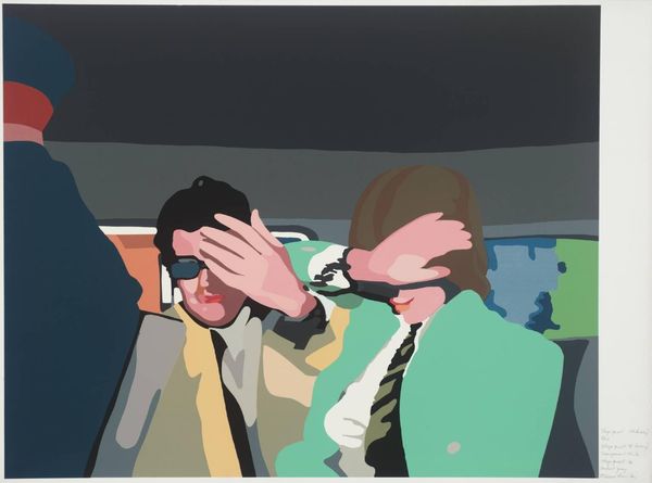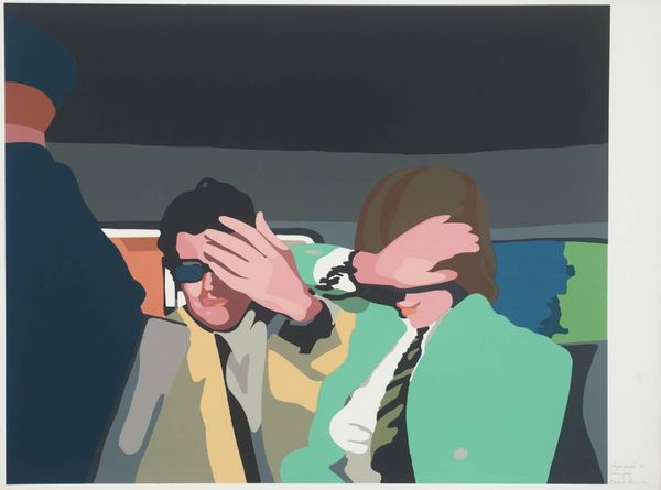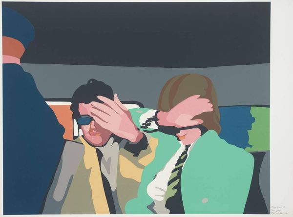 Curator: Richard Hamilton’s "Stage Proof 5" presents quite a stark image, doesn't it? The flat planes of color are immediately striking. Editor: Yes, and the hands covering the eyes suggest a refusal to see, a deliberate blindness. Is it willful ignorance, or forced censorship? Curator: Hamilton was deeply invested in the processes of reproduction, the way images are made and remade. Here, you can almost feel the screen printing process, the layering of colors and the way the image is built up. Editor: It feels very much like a cultural symbol of avoiding reality, perhaps even a comment on political apathy or denial in the face of uncomfortable truths. The hands are so deliberately placed. Curator: It is a rather pessimistic view, certainly, but Hamilton was always aware of the social forces shaping our perception. The work becomes a study in the consumption and creation of images. Editor: True. Looking at it again, I wonder if it’s about the manipulation of perception, the power of images to hide as much as they reveal. Curator: A potent combination of materials and meaning, then, wouldn't you say? Editor: Absolutely. It's a chilling image, made all the more powerful by its formal simplicity.
