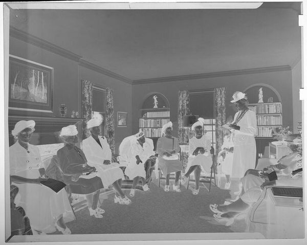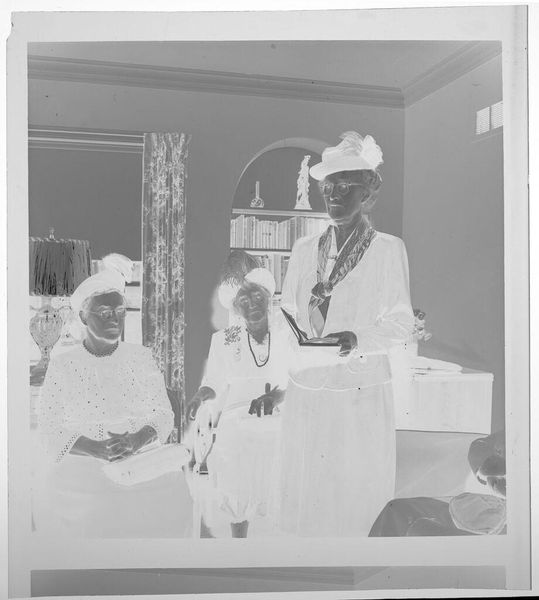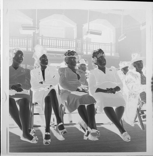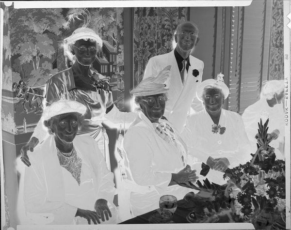 Editor: Here we have Jack Gould's "Untitled (elderly women at DAR meeting)" which doesn't have a listed date and the medium isn't specified either. The inverted color palette gives it this ghostly, almost surreal atmosphere. What do you make of this unusual rendering? Curator: It's evocative, isn’t it? The inversion transforms a mundane gathering into something… spectral. Almost like we're glimpsing a memory fading at the edges. The absence of details invites us to imagine the stories etched on their faces. What might those stories be, do you think? Editor: Maybe stories of resilience, community… judging by their outfits, maybe a bit of playful rebellion against expectations. Curator: Precisely! It's a photograph about history, remembrance, but also about the quiet power held by these women, captured in this peculiar, unforgettable way. Editor: I see it differently now, thanks!
