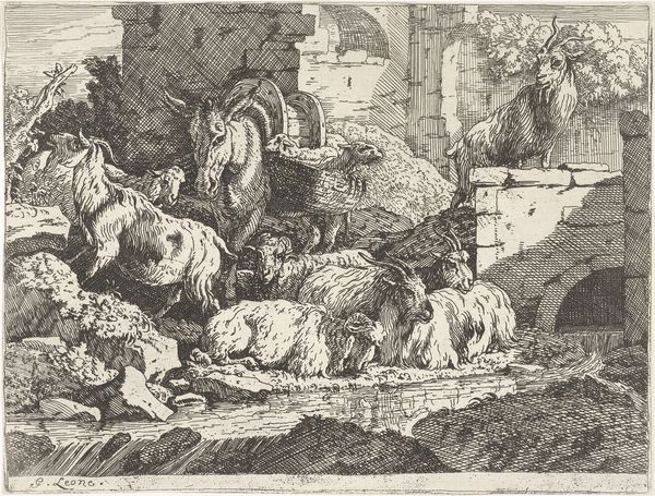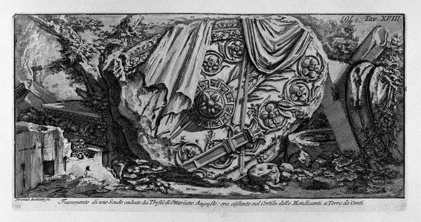This etching of an ancient altar and ruins was made by Giovanni Battista Piranesi, an artist fascinated by the grandeur and decay of classical antiquity. The image is rendered through a labor-intensive process of carving lines into a metal plate, which is then inked and printed. Piranesi exploits this medium to create a dense network of marks, capturing the textures of crumbling stone, overgrown vegetation, and scattered bones. Look closely at the contrast between the smooth surfaces of the carved relief and the rough, broken edges of the architecture. The fine lines and cross-hatching create an atmosphere of decay and the passing of time. The sheer amount of detail suggests a fascination with the physical reality of these ruins, inviting us to reflect on the labor involved in both their original construction and their subsequent excavation and documentation. Piranesi's printmaking thus becomes a way of preserving and reinterpreting the past, while also reminding us of the transience of human endeavor.