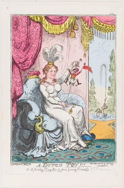 Editor: So, this is "The Prince of Orange as a Plaything for Princess Charlotte," likely from around 1814 to 1816, by George Cruikshank. It’s a print at the Rijksmuseum. It feels satirical, with the Princess holding the Prince like a puppet. What’s your take on it? Curator: Oh, it’s deliciously barbed, isn’t it? For me, this image speaks volumes about power dynamics, couched in what seems like innocent play. Consider the time – the Dutch monarchy was newly restored, with considerable British influence. Editor: So, is the Princess meant to represent Britain’s influence over the Netherlands? Curator: Precisely! Notice how she holds the Prince on a string, like a marionette, she looks pleased, but he does not. And that grand theatrical backdrop – isn't there something rather… staged about the whole affair? Does this image offer clues about British perceptions of Dutch agency? Editor: It’s pretty savage actually, when you frame it that way. I had just viewed this artwork as pretty and historical but, seeing how Britain controlled Netherlands back then adds to its understanding! Thanks Curator: You know, satire thrives on discomfort, and Cruikshank certainly delivers. Images like these – what are they for, what do they show of our history – are incredibly revealing of our anxieties and assumptions of people throughout our shared human experience. Isn't that something?