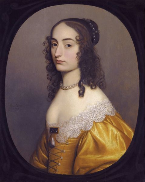 Gerard van Honthorst painted this portrait of Princess Elizabeth, Princess Royal, Abbess of Hervorden. Notice how Honthorst uses an oval format to tightly frame the princess, directing our attention to her face and attire. The artist employs a muted palette dominated by shades of green, brown and white. This understated colour scheme serves to highlight the textures and materials depicted, such as the sheen of pearls and the soft, curling strands of her hair. The composition is structured to emphasize Elizabeth’s status. The pearls lining the dress draw the viewer's eye and create a visual rhythm that speaks to both her elegance and her position. The use of light is also significant; it gently illuminates her face, giving her a serene and ethereal quality. This calculated use of light and shadow enhances the formal qualities of the portrait. The painting serves not only as a record of likeness but also as a semiotic representation of power, status, and dynastic identity.