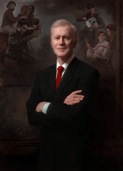 Curator: Oh my. First impression? Competence, I suppose. Not exactly radiating… joy, is it? More like, "I know things and I handle things." Editor: Precisely the point, perhaps? What we’re looking at here is Daniel Greene's 2017 portrait of The Honorable Larry Householder, Speaker of the House in Ohio, rendered in oil. It’s part of a tradition—commemorating leadership with paint. Curator: The tradition of enshrining power. Is it just me, or does official portraiture always have this…airless quality? Like posing with history is a serious, serious business. All dark suits and serious gazes. Editor: Absolutely! There's an entire visual language at play. The formal attire signifies authority; the direct gaze attempts to project trustworthiness—though that’s debatable in this case given later events! The Ohio Statehouse backdrop is subtly referenced but never overt, rooting Householder firmly within a specific socio-political context. Curator: Oh, context. Right. The plot thickens. It makes you think, doesn't it? Are portraits really windows to the soul, or just really effective PR? Look at the smoothness of the skin, that slight… softening of any potentially harsh lines. He appears approachable. Like a 'man of the people', but history offers other narratives. Editor: Indeed, this painting functions as a political artifact as much as a work of art. It’s destined to hang in halls of power, contributing to a carefully constructed narrative. The artist’s technique reinforces the idealization of authority. Greene's brushwork is meticulous, striving for realism—but also smoothing away any imperfections that might disrupt the image of control. Curator: I think there's this weird tension inherent in portraiture of powerful figures: do you aim for some kind of 'truth', whatever that even means, or do you serve the narrative? Here the intense details of the face versus the softer lines of his suit really highlights a deliberate creation of image. Editor: That is what makes Greene an excellent portrait artist—or an effective propagandist—depending on your perspective. Curator: What does this portrait leave us to consider, then, now knowing of the scandal that stained Mr. Householder’s legacy? I feel like seeing this piece opens an unexpected doorway, prompting us to rethink art's relation with truth, image-making and public memory. Editor: An official portrait becomes more interesting, and revealing, as time passes, doesn't it? This one challenges us to look beyond the surface and question the stories that are being told, and *who* is doing the telling.