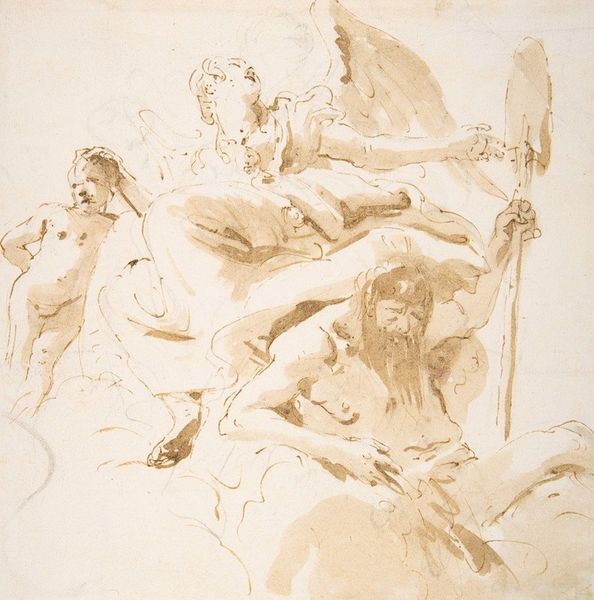 Giovanni Battista Tiepolo made this drawing of Prudence and a River God using pen and brown wash over black chalk. Tiepolo, working in 18th century Venice, navigated a world of aristocratic patronage and the rigid expectations of the church. This drawing hints at those expectations. We see Prudence, traditionally allegorized as feminine, standing with a mirror, symbolizing wisdom and foresight. Beside her is a seated river god. Figures like these were standard in Tiepolo’s time. His patrons would have wanted clear messaging and recognized symbols. However, the artist’s skillful execution is anything but standard. The drawing emphasizes the tension between established norms and the artist's own interpretation. The loose, fluid lines bring an energy to the composition. Perhaps Tiepolo is nudging against the confines of societal and artistic expectations, infusing the classical with a vibrant, personal expression. This balance of constraint and freedom is fascinating and it is palpable in the emotional depth of the piece.