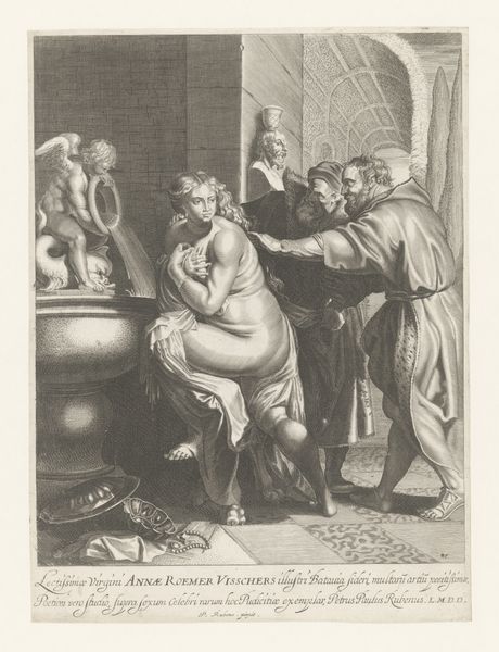 Paul Pontius created this engraving, "Susanna and the Elders," which depicts a biblical story of a woman being preyed upon by older men. The story of Susanna is one of gender, power, and morality. Susanna, a married woman, is spied on by two elders who attempt to blackmail her into sex. When she refuses, they accuse her of adultery, but her innocence is eventually proven by Daniel. Susanna embodies the struggles women have faced throughout history. The image encapsulates how women’s bodies become sites of struggle between personal autonomy, social expectations, and male authority. Consider the emotional weight carried by Susanna; her distress is palpable. It highlights the vulnerability and lack of agency women experience in patriarchal societies. The male gaze dominates, reducing Susanna to an object of lust. The image challenges us to reflect on our own roles in perpetuating or dismantling harmful power structures.