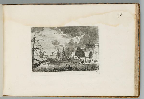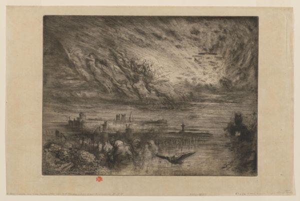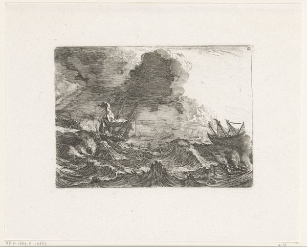 Curator: A tiny tempest! Adam Perelle conjures quite the drama in this print, "Storm at Sea, a Shipwreck on a Rocky Shore." It's deceivingly small, only about 4x6 inches, but packs an emotional wallop. Editor: My first thought? Chaos. That roiling sea, the listing ship—it’s the pre-industrial sublime, all nature’s fury laid bare. Curator: Exactly! And think of the symbolism—the ship, a fragile vessel against the overwhelming force of fate. The sea, that ancient emblem of the unconscious. Editor: I suppose one can’t help but see the vulnerability of human ambition. But I also find a certain grim beauty in it. It’s like nature reclaiming what was never ours. Curator: A beautiful point. It is fascinating to see how a tiny image can evoke such grand themes. Editor: Indeed, it invites us to reflect on our place within the larger world.