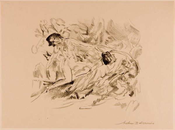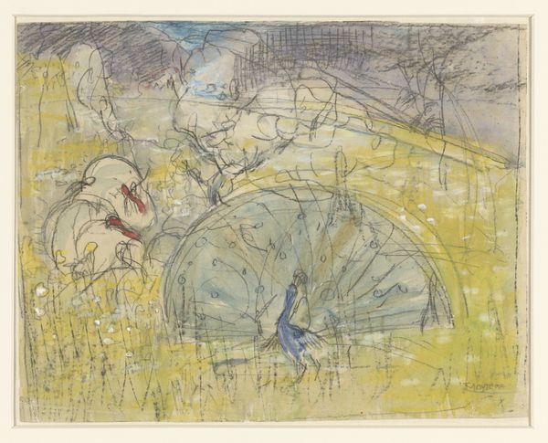 Editor: This drawing is called "Leda and the Swan" by Odilon Redon. The materials seem to be primarily watercolor and drawing media on paper. I find the depiction quite unsettling; the blending of human and animal form and the loose brushstrokes give a sense of unease. What stands out to you? Curator: Considering Redon's social milieu, this piece can be seen as a reflection of the industrial era's impact on traditional myths. How the materials—the fluidity of watercolor, the directness of drawing—are used to depict this violent encounter points to a critical engagement with the changing perception of beauty, desire, and power in the late 19th century. Do you think the haziness of the technique softens the mythological violence, or perhaps obscures and transforms it? Editor: That's a really interesting point. It makes me think about how the choice of these materials - drawing and watercolor, often associated with preparatory sketches or less "serious" art forms - might be challenging the traditional hierarchies of artistic production. But, looking closely, does this focus on process almost excuse the depiction of sexual assault in the image? Curator: The application of water-based media does not diminish this reality. Rather, by using such fleeting and delicate media, Redon intensifies the disquiet by rendering Leda vulnerable within a scene marked both with immediacy and spontaneity. He’s inviting us to contemplate the commodification and aestheticization of these themes and images in his contemporary moment. Editor: I hadn't considered that perspective. Seeing the work through a materialist lens reveals these fascinating questions of process, artistic value, and its cultural meanings. It gives me a whole new appreciation of how technique can shape our understanding. Curator: Absolutely. Thinking about the artist’s process, the material choices, and the artwork's engagement with societal anxieties truly enhances our understanding of works like this.