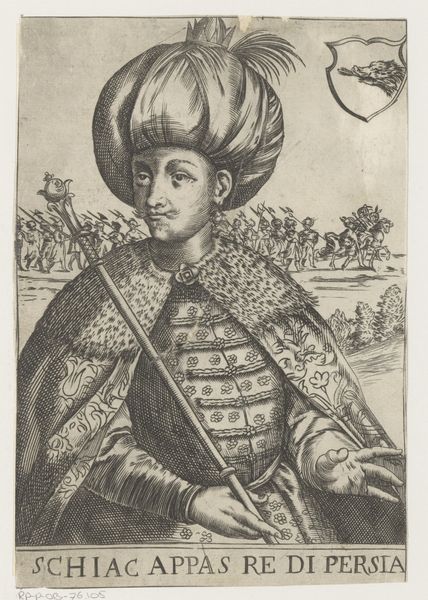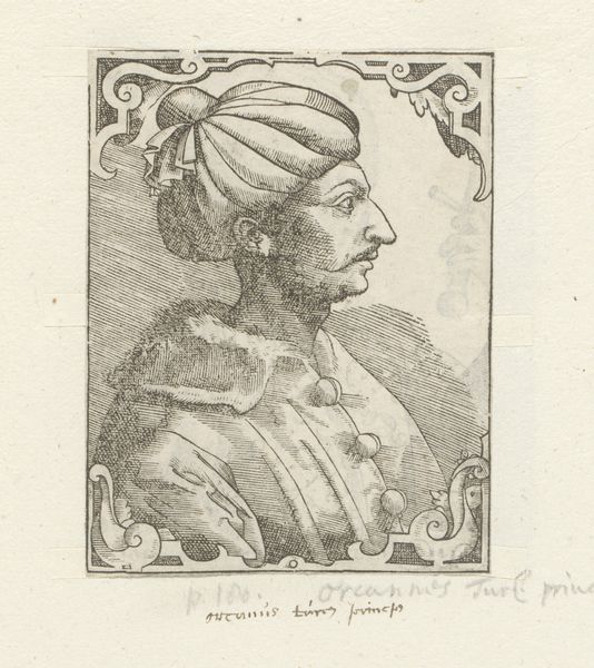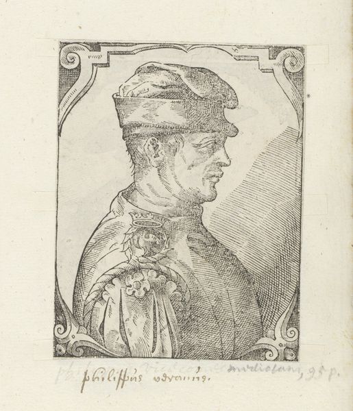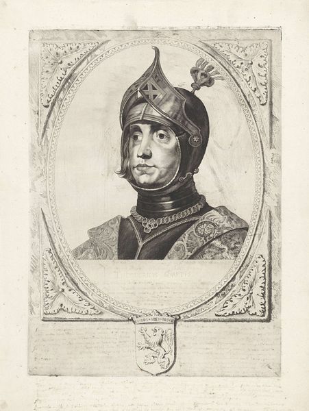Curator: This engraving presents a portrait of Muzio Attendola Sforza, dating roughly between 1549 and 1575. It's an intriguing example of the Italian Renaissance aesthetic applied to intaglio. Editor: My immediate impression is severity. The sharp lines of the engraving combined with Sforza's stern profile convey a powerful, almost unyielding presence. The scale is intimate, though. How was an engraving of this kind made? Curator: The engraver uses very precise, controlled cuts into a metal plate. Think of the material effort! This plate is then inked, and the image transferred to paper under great pressure, revealing fine lines and details. This process was demanding. Editor: Precisely! Look closely at the armor. Its design—those linked, almost omega-shaped patterns—feels so carefully wrought. It would take great skill and hours to create a printing plate this way. Are the symbols intentional or ornamental, though? Curator: Both, likely. Armor and costume of the Renaissance spoke volumes. A military figure like Sforza would deliberately utilize symbols of power, lineage, and personal identity. This helps place Sforza among other portraits that are deliberately cultivating memory and influence, and his expression carries a sense of dynastic authority. Note, too, the cherubs within the image's decorative framework. Editor: I keep returning to the line work, however. The parallel hatching defines the forms of the face and costume so efficiently. And the engraver captured such nuances of texture. He had real command of the materials and would have been well known to Sforza himself. Curator: Yes, indeed. Engravings served not only to immortalize, but to broadcast status to a broader audience than a painted portrait could. They were powerful vehicles for solidifying reputation through wider visual circulation. Editor: Thinking of that broadcast—it’s fascinating to consider how a fairly reproducible item could serve the unique image of this man’s importance in 16th century Italy. It adds a very interesting, complicated layer to notions of portraiture at the time, don't you agree? Curator: It is, truly, about the dance of the symbolic, social reach and, of course, enduring influence, so clearly shaped through the artisan’s careful and deliberate method.