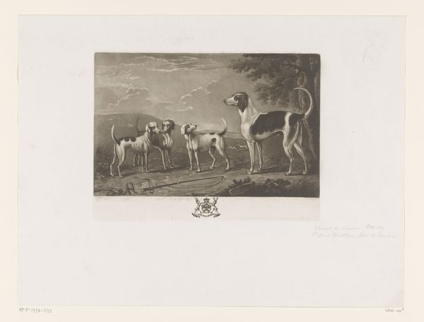 Curator: "Jager met tien jachthonden," or "Hunter with Ten Hunting Dogs," an engraving made sometime between 1819 and 1854 by François Grenier. Looking at it, it strikes me as a study in social order. But, from your perspective, what catches your eye? Editor: Well, it's quite detailed, and there is a charming naivete, and that arched top is also unusual. Given the precision of engraving, how would you analyze its production and cultural implications? Curator: Precisely. Let’s consider the engraver’s labor, the skilled hand meticulously transferring an image onto the plate. What materials were accessible at this time? Was this made accessible to everyone or specifically an affluent crowd? Also consider that prints like these democratized art; multiple impressions allowed wider audiences to access and consume imagery that once was confined to the elite. Editor: That's a fascinating point about democratization. Were engravings viewed as "lesser" art forms due to their reproducibility? Curator: Exactly. The traditional hierarchy placed painting and sculpture at the pinnacle. By focusing on the materials—the metal plate, the ink, the paper—and the repetitive, almost industrial, process of printing, we can see how this piece challenges the established boundaries between fine art and craft, prompting the audience to engage in the artform's economic structure. Does it not shift how we think about artistic value? Editor: I suppose it does! Viewing it through a materialist lens really highlights how art is intertwined with production and consumption. Thank you for highlighting those connections! Curator: The pleasure is all mine. It’s rewarding to unpack these layers and understand how seemingly simple images reveal broader socio-economic realities.