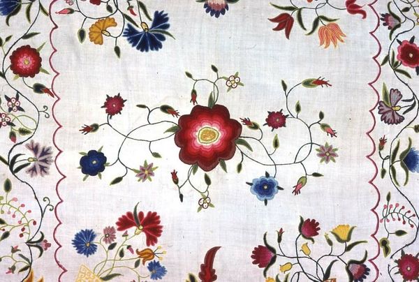 Curator: Looking at this piece, my initial feeling is one of serenity; it’s such a delicately crafted tableau. Editor: And, from my perspective, "Embroidered Picture," created in 1777, presents a captivating glimpse into the decorative arts of that period, demonstrating the artistry and skill of Elizabeth Jefferis. These meticulously stitched textiles were, and continue to be, profoundly intertwined with cultural expressions and social narratives surrounding femininity and domesticity. Curator: Yes, I see what you mean. I am very moved by the little birds perched among stylized, almost symmetrical floral arrangements – like little watchful spirits in a perfectly balanced garden. Almost feels like folk-art, though romantic too. Editor: Considering its era and likely context, this piece probably transcends mere aesthetics. It is possible this work functions as a testament to female accomplishment and intellectual engagement in a society that often circumscribed women's creative outlets to the domestic sphere. Jefferis' embroidery thus assumes a subversive dimension. Curator: Subversive embroidery! I love it. There is definitely a charming rebellion hidden beneath the soft colors. The material itself speaks of labor, and dedication. I mean, imagine the hours, right? But also it makes me think about how women turned their labor into art and beauty. Editor: Precisely! These weren't just ornamental exercises. Analyzing the symbology and recurring motifs reveals layered historical and social significance. For instance, the selection and placement of particular flowers or birds might allude to virtues, affections, or social affiliations prevalent at the time. Curator: Makes sense, it all does feel symbolic, from the colors, to the perfectly posed elements... It is amazing that such small and "sweet" work holds a history we still feel, very softly. Editor: Ultimately, understanding a work like "Embroidered Picture" involves recognizing its place within larger conversations about identity, gender, and cultural production, moving beyond sentimental readings to engage with the complex socio-political implications embedded within its threads. Curator: Exactly, it whispers tales if we take a minute to actually listen, right? It is indeed something far from "just" decorative art, and I see it much clearer thanks to our talk. Editor: And I realize my emotional response, my feeling, are rooted in more than intuition, they’re echoes of the artist’s context, just very gently calling to our own experience. Thank you.