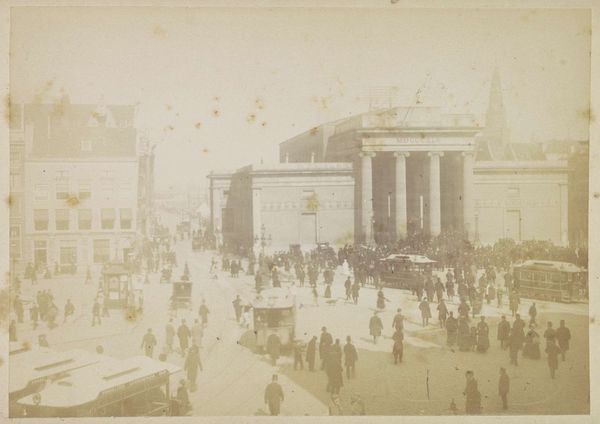 Curator: Standing before us is a historical document frozen in time: "Gezicht op de Dam met links 'Naatje' en rechts de Beurs van Zocher te Amsterdam," an albumen print likely created between 1860 and 1900. Editor: There’s a certain bustling energy about this cityscape despite the muted sepia tones. The geometrical precision of the architecture contrasts rather nicely with the indistinct movement of the figures and trams. Curator: Precisely. The artist, Andries Jager, captures the architectural layout through orthogonal lines converging on the horizon. I am drawn to the sharp, structural composition balanced by the distribution of shadows, highlighting both the monumentality of the buildings and the intricacies of city life. The materiality of albumen prints lends a soft, almost ethereal quality to the hard city structures, transforming the rigid geometry into a harmonious balance. Editor: But the albumen printing process! Consider the conditions in Jager’s studio and darkroom—the chemical labor and glass plates required to generate this view. Its historical value as evidence of early photographic techniques intersects so perfectly with Amsterdam's own industrious ethos at the time, all the trams, carriages, horses – the engine of commerce, really. And that large classical structure, The Beurs – a material manifestation of value itself. Curator: Yes, there's an inherent beauty to this reproduction, a tension perhaps, between documentation and aesthetic design which reveals the subject's spatial integrity. The arrangement and perspective create an intricate design meant to create a feeling of equilibrium. Editor: I am more concerned with labor as an activity integral to producing images of labour. To consider photography merely in terms of compositional harmony risks overlooking those exploited within emerging photographic industries and those whose material wealth permitted them leisure activity – to even pose for the photo at all! Curator: Certainly valid points; a more holistic analysis could embrace multiple theoretical angles, enriching the experience for all audiences! Editor: Yes, seeing this work does help clarify some important points on how artistic value and social history overlap through their respective making processes.