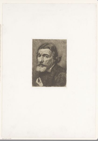 Frans Schwartz made this small etching, "Old Man with Split Grey Beard," using a metal plate and acid. The fine lines you see are actually tiny grooves incised into the metal. Schwartz would have coated the plate with a waxy, acid-resistant substance, then drawn through it with a sharp needle. When dipped in acid, the exposed metal would be eaten away, creating the lines that hold the ink. The image is then transferred to paper. What's so compelling here is how this indirect process allows for incredible detail, precisely capturing the old man’s weary expression and the texture of his beard. The material qualities of the etching medium—the biting action of acid, the fineness of the needle, and the receptivity of the paper—all contribute to the overall effect. It’s a labor-intensive process, demanding both technical skill and artistic vision. By appreciating the making, we can see that Schwartz wasn’t just creating an image, but also engaging with the rich history of printmaking as a craft.