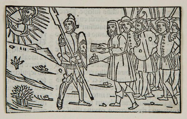 Curator: Here at the Harvard Art Museums, we have an intriguing piece titled "Illustration III" by an anonymous artist. The medium appears to be some form of printmaking. Editor: It evokes a strong feeling of age and perhaps ritual—the stark black lines against the aged paper lend it a solemn air. Curator: Notice how the artist uses line to delineate form and space, creating depth through the density of marks. The figures are stylized, yet the composition maintains a structured balance. Editor: The clusters of figures and the presence of symbolic elements like the tents and bundles of wheat suggest a narrative. It hints at themes of community, prosperity, and perhaps divine intervention. Curator: Exactly, and the interplay of light and shadow, though limited, defines the shapes and adds dimensionality to an otherwise flat plane. Editor: This print acts almost as a visual record, carrying the weight of cultural memory, even if the specific story remains somewhat veiled. Curator: Indeed. It’s a wonderful example of how a simple medium can convey complex ideas through form and composition. Editor: The image resonates with a timeless quality, inviting speculation about the historical contexts that gave rise to its symbolism.