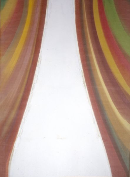 Editor: So, this is Morris Louis's "Beth Chaf," painted in 1959 with acrylic on canvas. I’m immediately struck by the… ethereal quality of the color and the flowing vertical lines. What do you see in this piece, looking at it purely from a formal perspective? Curator: What intrigues me first is the apparent flatness of the picture plane. Louis seems intent on minimizing any illusion of depth. Notice how the veils of color merge and interact directly on the canvas surface. The raw canvas showing through reinforces this flatness. How do you perceive the use of line in this context? Editor: Well, they are clearly very important to the composition, giving it that almost organic shape I mentioned before. I suppose they’re more like color fields than strict lines, but is there a rhythm or pattern at work here? Curator: Indeed, consider how Louis uses the pouring technique. The lines, as you call them, are deliberately uneven, possessing varied densities. We can follow the cadence as the green stripe disrupts the more muted hues. Ask yourself what that interruption accomplishes, how the colour’s chromatic value interacts to produce a sense of tension and release across the canvas. Does that linear divergence create something aesthetically? Editor: I see, the interruption almost emphasizes the rest of the painting. The single line in such strong contrast makes the rest of the colour-scape that much more cohesive, doesn't it? I understand a bit better about colour-field painting, focusing purely on the interaction between color and shape to impact the viewer. Curator: Precisely! And that directness of engagement with the visual elements, minimizing representation, leads us to a richer appreciation of the aesthetic experience itself. Editor: Absolutely! That was fascinating! It's really shown me the merit in paying more attention to form, technique and design in modern art.