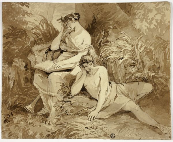 This anonymous drawing, "Young Man Accompanying a Young Woman on Horseback," presents us with a tonal study in brown ink, evoking a dreamlike quality. The soft washes and delicate lines render a scene where figures emerge from and recede into the earth-toned background. Notice how the artist uses the monochromatic palette to create depth and form, relying on subtle gradations to define the figures of the young couple and their steed. The composition itself is structured around a series of overlapping shapes, almost dissolving the boundaries between the subjects and their environment. The effect is to destabilize traditional notions of clarity and definition. Are we looking at an idealized vision of companionship or a meditation on transience and the elusiveness of form? The artist prompts us to question what we see and how we interpret it, reminding us that meaning is not fixed but constructed through our own perceptions.