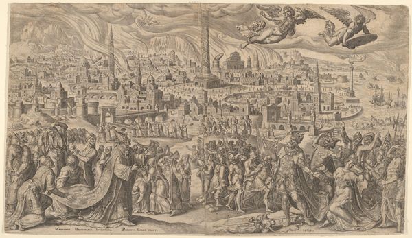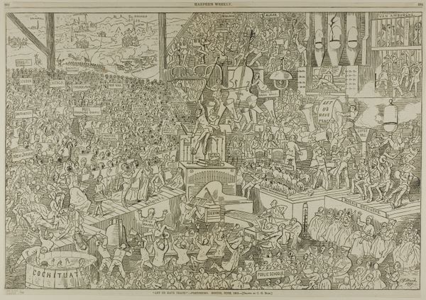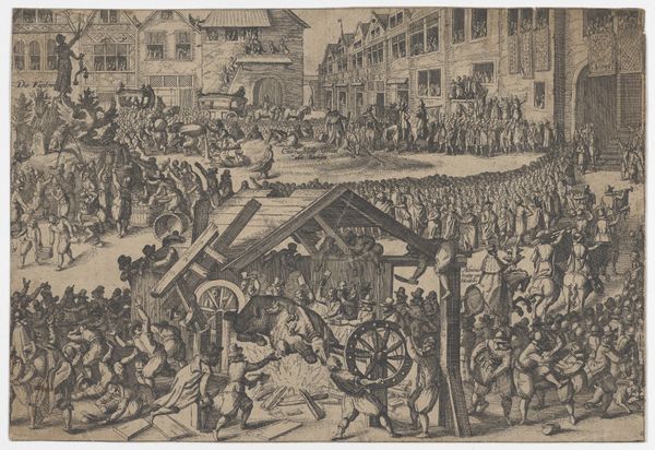 Lucas Cranach the Elder created this black line woodcut print, "The First Tournament," sometime in the early 16th century. During this period, tournaments were more than just sporting events; they were elaborate displays of power and prestige, reflecting the social hierarchies of the time. Here, Cranach presents us with a chaotic yet detailed scene of knights clashing, horses rearing, and spectators looking on from balconies. The composition captures the energy and spectacle of the event, but also hints at the underlying tensions and rivalries inherent in such displays. Consider how the artist uses the woodcut medium to convey both the grandeur and the grit of the tournament. The stark contrast between light and shadow emphasizes the drama of the joust, while the intricate linework captures the textures of armor, banners, and clothing. The image serves as a reminder of how power, performance, and identity were intertwined in the cultural fabric of the Renaissance.