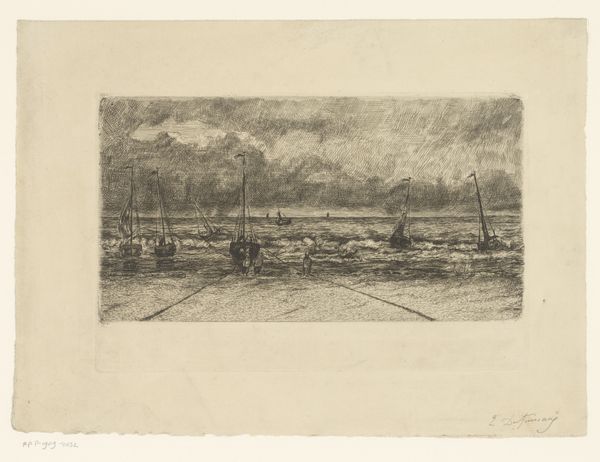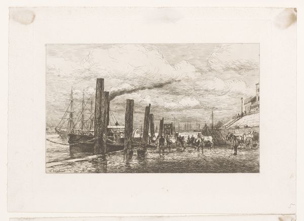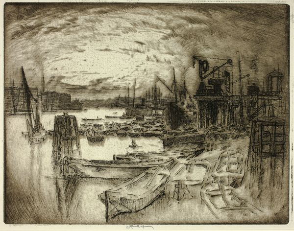 Curator: Joseph Pennell created this etching, "Tower Bridge, Evening," around 1905. It offers a compelling glimpse into London's docklands at the turn of the century. Editor: It’s melancholic, isn’t it? The soft etching creates a hazy, dreamlike atmosphere, a romantic vision of industry. The looming sky almost seems to weigh on the ships below. Curator: Absolutely. Pennell was deeply influenced by Whistler and the Aesthetic movement, focusing on the beauty and atmosphere of urban landscapes. He consciously engages with the romanticizing of modern industrial life. Editor: The bridge itself acts as an almost mythical gateway here. The steamboats seem to pass through it, vessels of industry entering into the city and, perhaps symbolically, carrying forward progress. There's a grand, almost allegorical feeling to it. Curator: Yes, the Tower Bridge was relatively new then, completed in 1894. It was hailed as an engineering marvel, embodying Victorian ingenuity and Imperial ambition. Pennell shows us how such structures are embedded in the collective psyche of the era. His prints contributed to its symbolic value. Editor: The smoke billowing from the ships becomes part of that almost ominous sky. I see a visual metaphor here: the literal smoke and shadow suggesting the darker side of industrialization, and also a more existential pondering of where the promise of "progress" will actually lead. Curator: Well, Pennell himself had strong views on this sort of progress! His focus in art was aesthetic pleasure and that cities presented that to him – unlike others, he celebrated the changes, seeing the beauty, not the darkness. Prints were his way to democratize and circulate his vision to the masses. Editor: So, he’s consciously shaping public perception of modernization. But I see something haunting in those delicate lines. The symbolic weight of these immense structures can be unsettling. I leave seeing a tension, one where industrial hubris sits next to human anxieties. Curator: A perfect summary: he made accessible through his printmaking something very powerful. Editor: Precisely, images such as these, etched into our cultural consciousness, shape not only our past but also our future perceptions of the narratives that are linked to cityspaces and to industry.