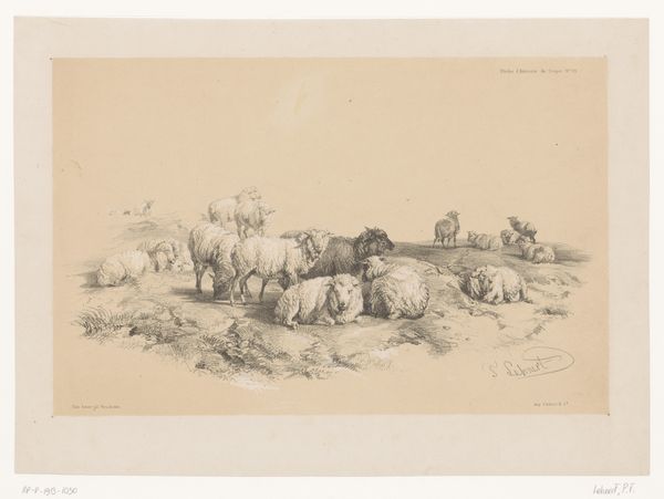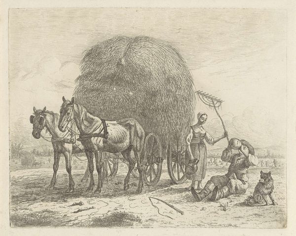Curator: Upon entering Gallery 12, we encounter "Landlieden bij een kar" – that is, "Farmworkers by a cart"— a pencil drawing dating from the period 1819 to 1881, attributed to Johannes Tavenraat and held within the Rijksmuseum collection. Editor: It’s the pervasive sense of lightness that grabs me; the sketch feels as if a fleeting moment has been perfectly captured. It has a somewhat romantic quality. Curator: Yes, it is categorized within Romanticism, and if we look closer, we can see Tavenraat has created an engaging genre painting here. The texture of the paper seems crucial, giving tooth to each carefully laid graphite mark to build shape, especially within the hay bales. Consider also the careful distribution of tones: dark around the figures for contrast and balance and delicate shading to give form to the figures in space. Editor: Thinking historically, genre paintings like these gained prominence during the early 19th century. They served as visual records but also, inevitably, played a role in constructing perceptions, sometimes sentimental, of rural existence for urban audiences. The family depicted here becomes emblematic. Who were these paintings really for, and what function did they fulfill? Curator: Functionally, I observe that the cross-hatching technique is quite evident throughout, lending to a great amount of shading and giving dimensionality to a drawing that would have otherwise been very flat. Note the loose quality; look how the shapes, figures, and features become fully realized through very economic lines. Editor: True, the style embodies both documentary realism and constructed symbolism. While ostensibly depicting rural life, its true function existed as propaganda: idealizing nature while obfuscating hardships endured by workers. Curator: Certainly, your analysis illuminates the socio-political framework in which such imagery gained prevalence, even while the drawing rewards simply dwelling on line quality, density, and composition. The dynamism that defines art finds no limits; even a mere pencil sketch invites scrutiny that goes deeper into both its essence as form and as statement. Editor: Precisely, an object’s essence remains enriched when its historical weight assumes center stage! These drawings serve as windows into the soul, which reveal not only beauty in art but historical insights.
