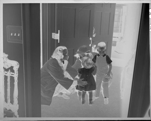 Editor: Here we see an intriguing untitled photograph by Martin Schweig depicting a woman in a Hawaiian costume kissing a man in a fancy foyer, with a servant in the background. It's interesting how it juxtaposes what seems like a staged, exotic performance with an opulent interior. What's your take on this image? Curator: It's fascinating how Schweig captures a moment that's both intimate and performative. The backdrop suggests wealth and power, while the Hawaiian costume introduces elements of exoticism and perhaps even appropriation. How does the presence of the servant complicate the scene, in your opinion? Editor: I think it emphasizes the power dynamics and maybe even the commodification of culture. It definitely feels like there's more to this image than just a simple kiss. Curator: Precisely. It speaks volumes about the era's social norms, cultural perceptions, and the implicit power structures at play within such a setting. Editor: I see what you mean! Thanks, that gives me a lot to think about.