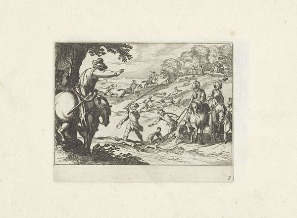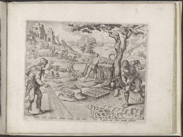 Curator: Standing before us is an engraving titled "Arbeid is de taak van de derde stand," or "Labor is the task of the third estate," which historians believe was produced sometime between 1565 and 1635. Editor: It immediately strikes me as a stark portrayal of relentless work. The landscape is teeming with figures engaged in different forms of labor, their postures reflecting hardship and perseverance. There’s something quite somber about it despite the active scene. Curator: Exactly. It's vital to remember the social context. Prints like these served to reinforce societal hierarchies. The "third estate," the commoners, were explicitly depicted as those whose burden it was to perform labor. Editor: The figures almost seem allegorical, as if they represent broader societal forces at play. Consider how the image depicts an entire community engaged in essential agricultural tasks. Could the oxen and the sowing of seeds be a call to prosperity achieved solely through their work? Curator: Undoubtedly. The image perpetuates a certain ideology. We see the working class tied to the land, their lives dictated by physical toil. There is that building at the top; they're making the structures which are more for someone else than them. The text at the bottom literally enforces the point - commoners are not for high affairs, or religious works! Editor: It makes me wonder about the serpent. It seems almost strategically positioned overlooking everything; is that a possible link to the "original sin", where manual labor and human effort were divine retribution? That connects so well with the rest of the composition! Curator: Intriguing thought. And it reinforces how the ruling classes co-opted religion in a period of conflict to legitimize power, ensuring social order through imagery. But here, at the Rijksmuseum, centuries later, we can question the politics. Editor: Seeing it now, through our contemporary lenses, reveals both the historical weight and the continued power dynamics encoded in visual representations of labor. It's a fascinating artifact. Curator: I concur; art provides historical perspectives into societal biases. This print urges us to be wary of such enduring rhetoric, whether it is found in politics, society, or art.