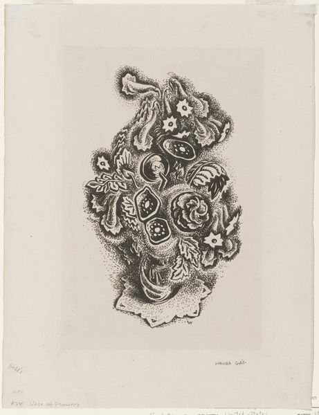 Editor: So, here we have Rudy Pozzatti’s 1963 ink print, "Marcus Aurelius." The textures are so fascinating, almost violently abstract, but then a recognizable portrait emerges. It’s quite striking! What’s your read on this? Curator: It’s compelling, isn't it? Pozzatti appropriates a classical figure – a Roman emperor, philosopher king – and subjects him to this almost chaotic abstraction. Consider the socio-political climate of 1963; the Cold War was escalating, societal upheaval was brewing. Does this abstraction become a visual metaphor for the anxieties of the era, a fracturing of established authority? Editor: That's an interesting angle. I was focused on the figure himself, perhaps some comment on mortality given the decaying texture, but the historical context changes the game. Was Pozzatti actively engaging with those anxieties, do you think, or simply reflecting a general mood? Curator: It's likely a combination. Artists operate within and react to their present. Think about how institutions like the Roman Empire have been historically used as symbols of power, and how artists like Pozzatti might intentionally challenge those representations during times of instability. The seemingly haphazard ink blots become charged with meaning. Editor: So, it’s less about *Marcus Aurelius* the individual and more about what he represents in the public consciousness, then destabilizing that image? Curator: Precisely! Consider the medium – a print. It allows for reproduction, dissemination. He takes an elite figure, breaks him down, and makes that fractured image widely accessible. It democratizes and critiques simultaneously. Editor: Wow, I hadn't considered the role of the print itself in conveying meaning. Thanks, that really changes my perspective on this work. Curator: It is my pleasure. This dialogue about power structures and how this has informed our experience with this work has also altered my experience of it as well.