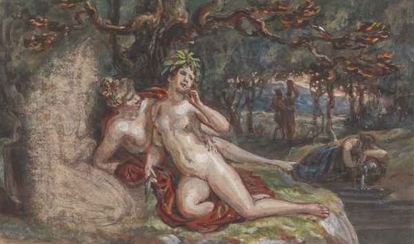 Berthe Morisot painted 'Apollon Révélant sa Divinité à la Bergère Issé' using oil on canvas. Notice how Morisot blurs classical mythology with impressionistic techniques. The composition is structured around fluid brushstrokes and a muted palette, dominated by blues and greens, which creates a dreamlike atmosphere. The figures of Apollo and Issé are softly rendered, almost dissolving into the surrounding landscape. This diffusion of form destabilizes traditional representations of mythological subjects, where clarity and detail were paramount. Morisot's handling of paint challenges conventional academic painting. The loose, expressive strokes reject a fixed, singular meaning, embracing ambiguity. This approach reflects broader artistic concerns of the time, questioning established values and exploring new modes of perception and representation. The interplay of light and shadow further emphasizes the fleeting nature of the divine revelation. Ultimately, the painting's formal qualities and use of color engage with philosophical ideas about the transient and subjective nature of reality.