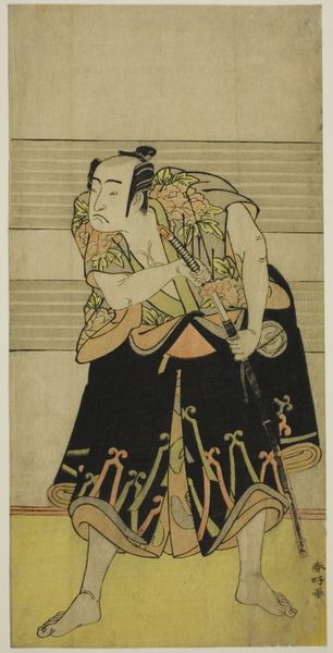 Editor: Here we have Katsukawa Shunko’s woodblock print, "The Actor Ichikawa Komazo III as Katanaya Hanshichi," created around 1789. It’s amazing how the artist captured the actor's likeness. The simplified lines and shapes have a rather dramatic, stylized impact. What draws your eye when you look at this piece? Curator: Immediately, the juxtaposition of flat planes and subtle gradations seizes my attention. Note the sharp delineation of the figure against the neutral ground. Shunko manipulates color—observe the restricted palette of salmon, black, and beige—to establish a complex visual hierarchy. How does this controlled chromatic range affect the overall structure? Editor: I think it makes the patterns on the robes stand out more, but the colors are still subdued, so it doesn’t become too busy. Do you think the asymmetry adds something? Curator: Precisely. The off-center composition is crucial. Shunko orchestrates asymmetry to imbue the figure with a kinetic quality, an implied movement. Consider how the black kimono pulls the eye in a particular direction, while the fall of leaves echoes it at the top. What of the placement of negative space? Editor: I hadn’t noticed before, but there is much more empty space above the figure’s head, making him look almost trapped or confined despite being outdoors. Curator: Intriguing. That reading finds support in the subtle angularity across the planes. Observe the angular fold of the sleeves. Every element, from the line of the jaw to the pattern of foliage is consciously plotted, building tension with visual discord, wouldn't you say? Editor: It's fascinating how the print seems so simple at first glance, but there's actually a lot of thought and planning in every single detail. Curator: Precisely. Recognizing such structuring allows one to apprehend the deeper structural grammar embedded within the artwork.