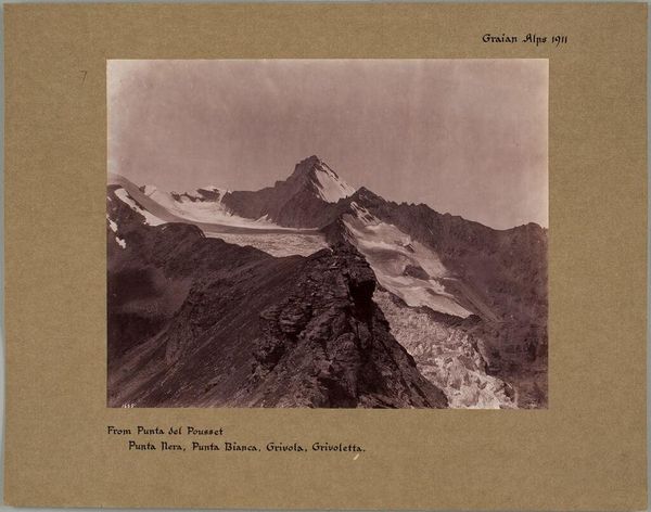Editor: Here we have George Perry Ashley Abraham's photograph, "The Top of the Lyskamm, Pennine Alps." I’m struck by how this image captures the drama and the sublime terror of the natural world. What societal views might have influenced the choice to depict such a scene? Curator: The rise of mountaineering as both sport and spectacle during that era is key. Consider how photography itself was becoming more accessible, democratizing the experience of these exclusive, dangerous locations. How might this image, then, reinforce or challenge existing power structures? Editor: So, it's about access and control, framing nature for a specific audience? Curator: Precisely. Think about who could afford the equipment, the expeditions, and ultimately, consume this image. It's about shaping a narrative around nature. The viewer's experience becomes mediated by class and the artist's perspective. Editor: I never considered how social status affects our experience of nature. Curator: Exactly! This image is more than just a landscape. It's a reflection of its time.