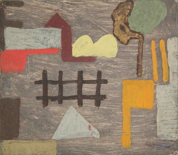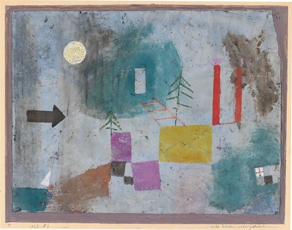 Paul Klee created "With the two lost ones" in the early 20th century using oil on cardboard. The composition suggests a landscape with abstract shapes that hint at natural forms, like a sun, or bodies of water, where two small figures stand at the lower left. Klee worked during a period of significant social and political upheaval in Europe, including World War I and the rise of totalitarian regimes. His involvement with the Bauhaus school, an institution dedicated to integrating art, craft, and technology, also encouraged experimentation and a rethinking of art's role in society. Many consider his abstract symbolic language as a means to critique the institutions of power that led to conflict. To truly understand Klee's work, we turn to historical archives, artists' writings, and critical analyses that reveal the complex interplay between artistic expression and the socio-political context. Through rigorous research, we come to see how artworks are not made in a vacuum, but are deeply embedded in the social and institutional forces of their time.
