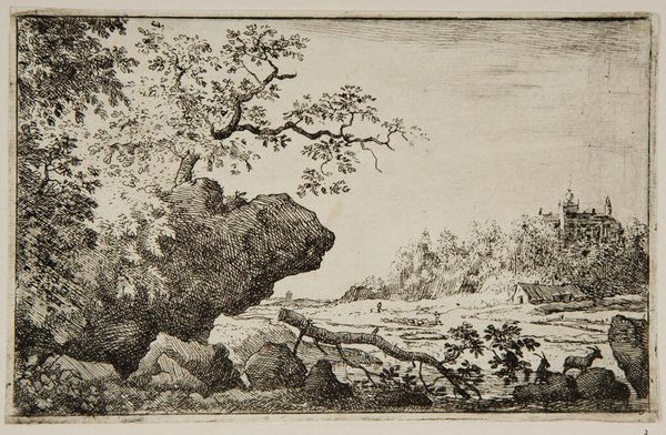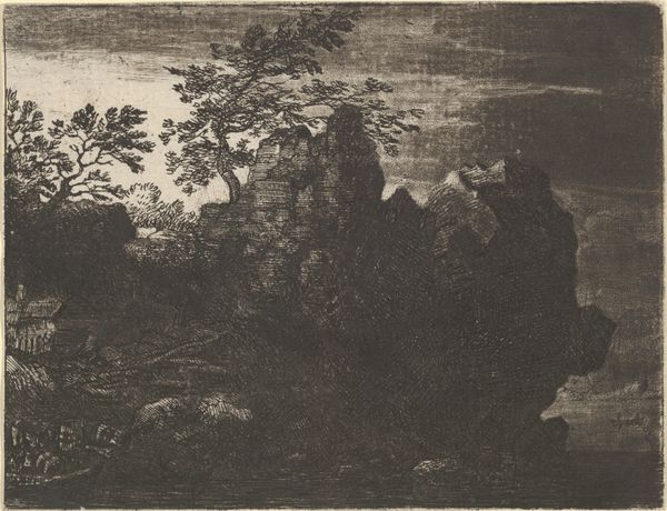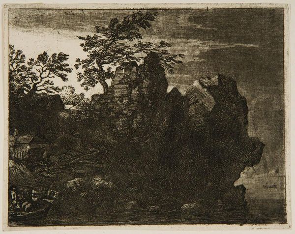 Editor: Here we have Allart van Everdingen's "The Large Rock at the River," a small etching. The texture is so dense, it almost feels like I could reach out and touch the rough surface of that rock. What strikes you about this piece? Curator: I see an artist engaging with the very physicality of the world. The etching process itself—the biting of acid into metal, the labor of producing multiple impressions—mirrors the geological processes that form such a rock. It asks us to consider the means of production, both artistic and natural. Editor: That’s a cool perspective. So you’re saying the method mirrors the subject? Curator: Precisely. It makes one think about the value we place on "high art" versus the labor involved in both its creation and the shaping of the natural landscape. Editor: I see what you mean; it definitely gives me a lot to consider about art and the physical world. Thanks!