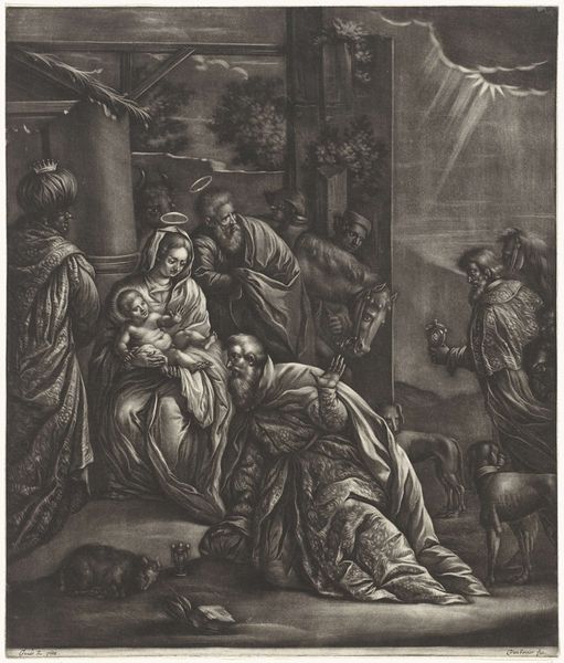 Editor: This is "Christus in hof van Getsemane," or "Christ in the Garden of Gethsemane," an engraving by Frans van den Wijngaerde, made sometime between 1636 and 1679. The use of light and shadow is striking, and creates a very dramatic mood, like a stage setting. How do you interpret the strong contrast in this piece? Curator: The intense chiaroscuro is quintessential Baroque, but I think it goes beyond mere drama here. The spotlight on Christ, set against the darkened figures of the sleeping disciples and the approaching soldiers, speaks volumes about isolation and the burden of responsibility. Considering the social and religious upheavals of the 17th century, the work becomes a commentary on leadership and the price of conviction. Is Christ’s luminous glow empowering or isolating? What about the sleeping figures; do they reinforce the feeling of religious loneliness and abandonment, and how do their figures relate to contemporary images of conflict avoidance or denial? Editor: That's a perspective I hadn't considered. I was focused on the religious aspect, but you're right, it also resonates with ideas about standing up for what you believe in. The fact that the disciples are asleep reinforces a sense of loneliness and neglect, of Christ being unsupported, making a difficult, world-changing decision entirely alone. Curator: Precisely. It prompts us to question the nature of solidarity. Where are the societal structures of support in moments of moral crisis? It encourages conversations around faith, authority, and the complexities of bearing witness. Who are the sleeping disciples in today's societal conflicts? And, conversely, what burdens might one experience through standing alone? Editor: It is amazing how relevant these historical works become when viewed with socio-political considerations. Thanks for pointing that out! Curator: My pleasure. These engravings help us visualize how relevant these enduring themes of power, sacrifice, and societal responsibility remain.