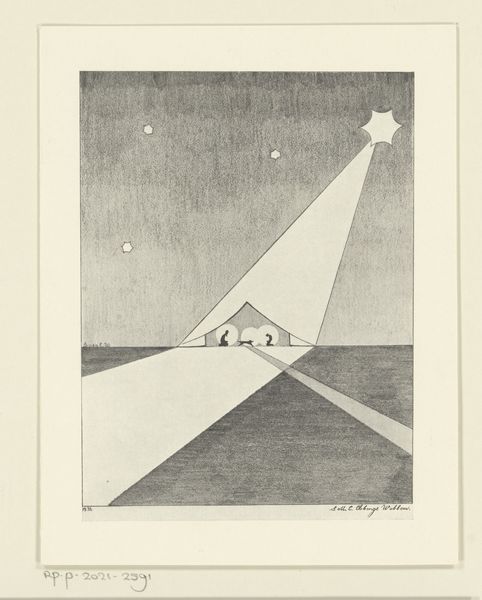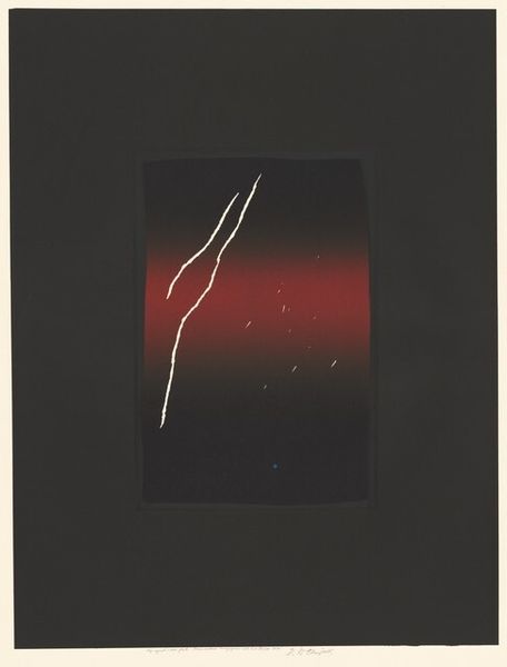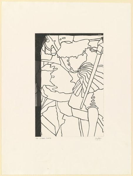 Editor: Here we have Jasper Johns’s 1997 print, "Leo [1st state]." The composition, with its minimal figures under a starry sky, gives me a sense of looking at some distant, maybe even prehistoric, event. What strikes you when you look at this piece? Curator: What I see is a commentary on representation itself. Consider the date, 1997: Johns is engaging with his earlier work, specifically how symbols evolve and are re-contextualized over time. The seemingly simple stick figures are not merely primitive humans; they’re also a reduction, an abstraction of the human form. Who gets represented in art, and how? This speaks volumes, especially when considered through a lens of inclusivity and visibility. How can the simplest form evoke complex narratives about personhood and agency? Editor: That's fascinating. I hadn't considered it as a statement about representation itself, just as simple figures. Are you saying the minimalism is deliberate, almost political? Curator: Precisely! The “primitive” aesthetic can be deceiving. Whose stories are told through art, and how are those stories validated, particularly within a dominant cultural narrative? Johns’ work challenges us to consider art history's gatekeepers. How does an artwork either perpetuate or subvert existing hierarchies of power? And who are the figures absent from this depiction? Editor: So the "simplicity" becomes a critical tool. I hadn’t thought about it in terms of challenging art historical canons and power dynamics. Curator: Exactly. It is in what is left out, that the challenge appears. Thinking about it from this perspective really transforms my reading of the artwork, wouldn't you agree? Editor: Definitely. I’m leaving with a totally different perspective on Johns and his prints. Thank you!