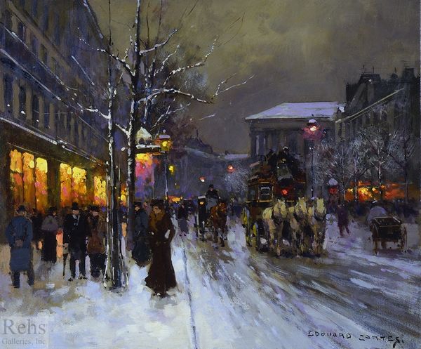 Editor: Here we have Edouard Cortes’s “Place Pigalle, Winter Evening,” an oil painting depicting a bustling Parisian street in winter. I’m struck by the contrast between the cold, snowy setting and the warm glow emanating from the buildings. How do you interpret this work? Curator: I see a representation of class and commerce, masked by the romantic gaze typical of Impressionism. Note how Cortes highlights the movement and vibrancy of city life. The light isn't just picturesque, it is labor, fuel, and the engine of commercial exchange. I would suggest asking yourself: Whose city is being depicted? Who benefits from its romantic allure and the constant movement depicted here? Who is omitted from the painting, and what does that tell us? Editor: That’s interesting. I hadn't considered the perspective beyond the visual appeal. It does seem like it is a very idealized version of city life. Are we supposed to think of it critically or just enjoy the beautiful light and movement? Curator: I believe art invites us to engage critically, to consider whose experiences are prioritized. The painting’s emphasis on leisurely street scenes and the exclusion of, say, the poor or working class of the area is a political statement in itself. Considering questions of social exclusion, representation, and even urban development, in whose interests are these kinds of scenes are perpetuated. Editor: So, while beautiful, the painting is not necessarily an accurate reflection of reality? Curator: Precisely! By analyzing art through lenses of power, class, and representation, we challenge dominant narratives and strive for a deeper understanding of history and contemporary life. Editor: I've never thought of it like that. Thanks, I will keep these considerations in mind! Curator: That’s fantastic! Remember, art history is not just about dates and styles; it's about critically examining how power operates within society.