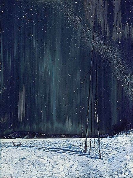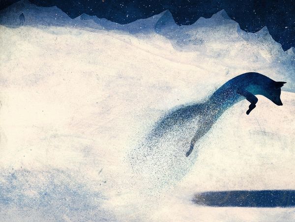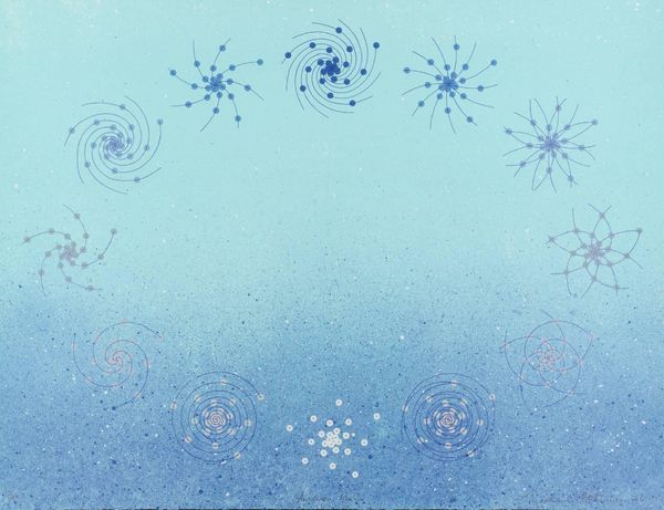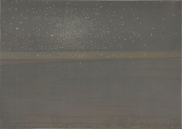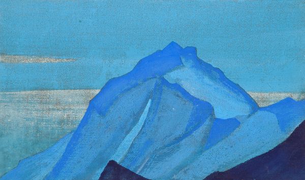 Editor: So, this is "Frosty Mongolia," a watercolor painting by Nicholas Roerich from 1935. The whole scene has this almost dreamlike, cold atmosphere. It really captures the sparseness of the landscape, but there is also a subtle presence of warmth. How do you read this piece? Curator: Thank you for introducing this subtle and elegant piece. Viewing the work through a formal lens, the most immediately striking element is the chromatic harmony achieved through the limited, almost monochromatic palette. Notice how the variations of blue are carefully modulated to create a sense of depth and atmosphere. Editor: Yes, there is so much variation, yet they still blend cohesively. Curator: Exactly! And the composition is ingeniously simple, isn't it? The low horizon line emphasizes the vastness of the sky, contributing to that feeling of sparseness you mentioned. Observe how the snowflakes are rendered; they act as individual points of light, distributed to suggest an all-encompassing field of vision. Also note how he strategically positioned the small figure; this human element provides scale but also emphasizes the individual's insignificance compared to the natural forces surrounding him. How do you feel this affects the overall dynamic? Editor: That is really impactful, like he's intentionally being swallowed up by the environment, but also standing powerfully against the cold. Curator: Precisely! And lastly, while subtle, the presence of architecture anchors the whole ethereal and minimalist work in concrete reality, demonstrating Roerich's brilliant combination of line and wash, merging a tranquil color palette into a memorable painting. I notice something different each time. Editor: I can appreciate this work more, seeing those stylistic features. It definitely has greater impact when we delve into these elements!