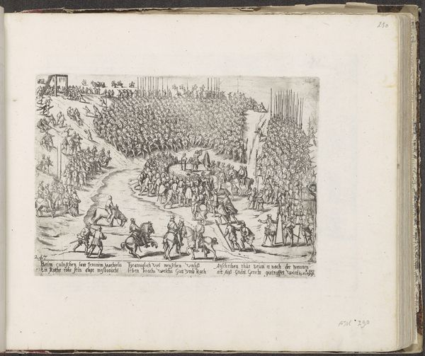 Curator: Looking at this detailed engraving by Frans Hogenberg titled "Hendrik IV goes to church in Saint-Denis, 1593," dating from 1593 to 1595, I'm struck by how carefully constructed the narrative is within the print's confines. Editor: It feels like two scenes stitched together. A stately, ceremonial entrance on the left contrasts with a public display of horsemanship, almost chaotic in energy, to the right. Curator: Exactly! Hogenberg masterfully captures Henry IV's conversion to Catholicism in 1593. This strategic political maneuver allowed him to be crowned King of France and pacify the country after years of religious war. Notice how the interior scene is all solemnity and controlled lines. Editor: The columns form almost a cage, and the crowd watching him seems like a separate world. Yet Henry moving into that space signals a symbolic shift, embracing not only a new religion but the power dynamics of France itself. I see symbols of cleansing, absolution... the somber hues reinforcing it. Curator: Precisely. Saint-Denis was, and is, an incredibly powerful symbol. It held significant royal weight as it served as the burial place of French monarchs. By converting and going to church there, Henry made a calculated visual statement. It’s interesting that Hogenberg depicts what might have taken place outside simultaneously with the procession. Editor: I find the outdoor equestrian display fascinating. It could speak to the public celebration of Henry’s conversion and kingship, while at the same time suggesting the continued military aspects needed to retain order and peace. The horses, often stand-ins for nobility and power, racing freely. It evokes a show of strength after a long and difficult conflict. Curator: And let’s not forget the group gathered in the grandstand, also celebrating Henry’s coronation. I wonder about the commissioning and reception of this print, destined, in all probability, for distribution and propaganda to consolidate support. It had the function of solidifying Henry’s newly legitimized place in power. Editor: It's impressive how Hogenberg blends ceremony and political strategy into a single image, using potent iconography and visual language to sway public opinion, and visually codify Henry's conversion. Curator: It really drives home the immense social and political stakes inherent in Henry's choice and actions during that tumultuous period in French history. Editor: A true masterclass in visual persuasion, reflecting how personal faith intersects with immense political force, influencing history through symbolic representation.