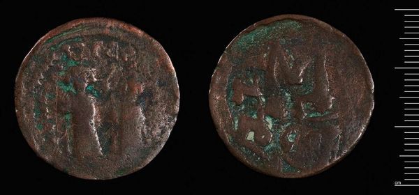 Editor: Here we have a coin of Justinian I from the Harvard Art Museums. It's a weathered bronze, and I'm struck by how something so small could represent such immense power. What significance do you see in the imagery presented? Curator: Consider the portrait, the inscription – they speak of authority, but also of a desired legacy. How does the Chi-Rho, the early Christian symbol on the reverse, inform our understanding of Justinian’s reign? Editor: It suggests the intertwining of religious and political power, right? Curator: Precisely. The image becomes a cultural touchstone, its value shaped by layers of meaning. What endures when empires fade, but symbols remain? Editor: That's a powerful thought. I’ll definitely look at coins differently now!