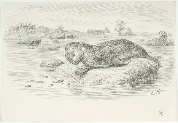 Editor: This is Karl Bodmer's print, simply titled "Otter". I'm drawn to the dynamism of the otter’s pose. What visual narratives do you find embedded in this image? Curator: Notice how the otter, a symbol of playfulness and adaptability, is rendered amidst dense reeds. Does this juxtaposition suggest a deeper narrative about nature's resilience, or perhaps humanity's relationship with the wild? Editor: That's interesting! I hadn't considered the contrast. Curator: Consider also that Bodmer accompanied Prince Maximilian zu Wied-Neuwied on his expedition to North America. How might Bodmer's experiences shape his depictions of animals and landscapes? Editor: It’s amazing how much cultural context can be packed into a single image. Curator: Precisely! Each element, from the otter's posture to the texture of the reeds, carries a symbolic weight that resonates across cultures and time. What new understandings can we apply to contemporary conversations about nature and its preservation?