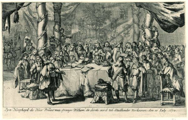 Curator: We’re looking at a fascinating engraving titled “Banket met de betrokkenen bij het Schmalkaldisch Verbond,” created by Peter Troschel sometime after 1630. It's a dense, detailed composition. Editor: My immediate reaction is that the lines are incredibly precise. Look at the meticulous hatching and cross-hatching; it gives a sense of depth, even though the perspective feels slightly flattened. There's a formal quality to the image that almost feels like a record. Curator: Absolutely. This print commemorates the Schmalkaldic League, a significant alliance of Protestant territories within the Holy Roman Empire during the Reformation. You can see the figures named above their heads at the table, a literal seating of power. The banquet becomes a symbolic feast. The table under the canopy becomes a stage, emphasizing their unity. Editor: Yes, I notice the grapevine above, providing an arch. Symbolically, could this be the union and bond? The architectural structure of the vine seems equally vital, it's almost as structural as organic, creating a strong sense of enclosure and… formality. Curator: Exactly. Grapevines are deeply rooted in religious symbolism and linked with spiritual communion, which gives a solemn dimension to the depiction of this assembly. We also see all the wine serving below and at the sides: the containers, the server, even the fountain. The emphasis of wine, a central Eucharistic element, connects the political with spiritual motives, so you can understand their commitment to one another. It portrays an ideal. Editor: Interesting point! But focusing on the artistry of Troschel’s choice of engraving in this format to tell this visual narrative creates some issues with composition: Look at the figures standing below, bringing in refreshments – they are nearly the same scale as the seated leaders! Compositionally, this creates a spatial ambiguity, although this creates some nice depth of space into the frame. Curator: Yet that might also mirror the complex power dynamics present at the time – a visual representation of how actions at multiple levels were crucial for political alliance, rather than obscuring Troschel draws awareness of their significance and interconnectivity within this political era. The detailed representation and symbolism capture an instant that has been kept relevant across decades. Editor: Looking at the contrast in lighting also keeps your eye moving through this rich depiction! It makes the mind reflect upon our constant interest and investment in this era, that we must understand and study this time of such rich development, from our place outside of it, to know more about today.
