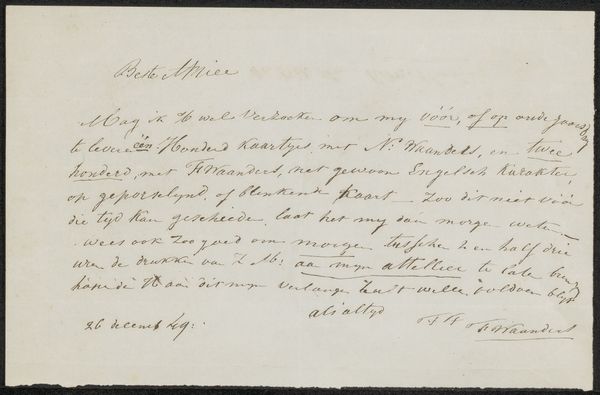 This is Johannes Bosboom's letter to Lambertus Hardenberg, penned sometime in the 19th century. Bosboom, a towering figure of the Hague School, exchanges words with Hardenberg, a man who would become a significant figure in Dutch society and politics. More than ink on paper, this letter invites us into the social and intellectual milieu of the Dutch Golden Age's twilight. Here, the nuances of class and connection, artistry and politics intertwine. As Bosboom's elegant script unfolds, we glimpse not only the networks that sustained artistic production but also the ways in which personal relationships shaped the broader cultural landscape. Each stroke of the pen echoes the weight of societal expectations. In essence, this missive whispers of untold stories, challenging us to consider the intricate dynamics between the individual, their art, and the society they inhabited.