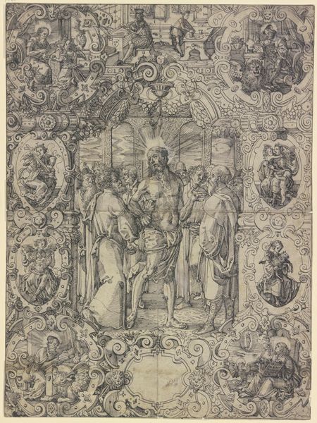 Editor: This is a pen and ink drawing from the mid-16th century by Andrés de Melgar, titled "Griffins, female grotesque, mask and figures". There’s such a bizarre, almost chaotic energy to it, yet the symmetry is also quite striking. What do you make of this piece? Curator: I see a fascinating intersection of power, gender, and religious tension characteristic of the Renaissance period. Note the prominent griffins, symbols often associated with strength and guardianship, flanking a central female figure holding aloft what appear to be offering bowls. Does that dynamic call to mind any power structures or social hierarchies of the time? Editor: I guess the woman presenting is subservient to the mythical creatures? It's kind of weird that she's presenting the dishes. And there's a devilish face, almost gargoyle-like, peering from above! Curator: Precisely. And consider how the idealized figures within the central frame are being 'watched' by the monstrous mask above, almost judged by some unyielding societal standard. It really encapsulates the Renaissance tension between humanism and lingering medieval anxieties surrounding sin, temptation, and the female body as a site of both. The drawing compels us to question whose stories are elevated, and whose are pushed to the margins, becoming monstrous. What statement do you believe the artist is trying to convey through the juxtaposition of sacred imagery with profane and fantastical ones? Editor: Wow, I hadn't thought of it like that. Maybe Melgar critiques those power dynamics. Seeing it this way makes it seem much more complex than just a historical curiosity. Curator: Exactly! And it prompts us to examine how those tensions still resonate in our present day. Hopefully you'll incorporate those thoughts when crafting the gallery materials. Editor: This was incredibly helpful! I'm leaving with so many insights and an altered perspective of historical art's relevance.